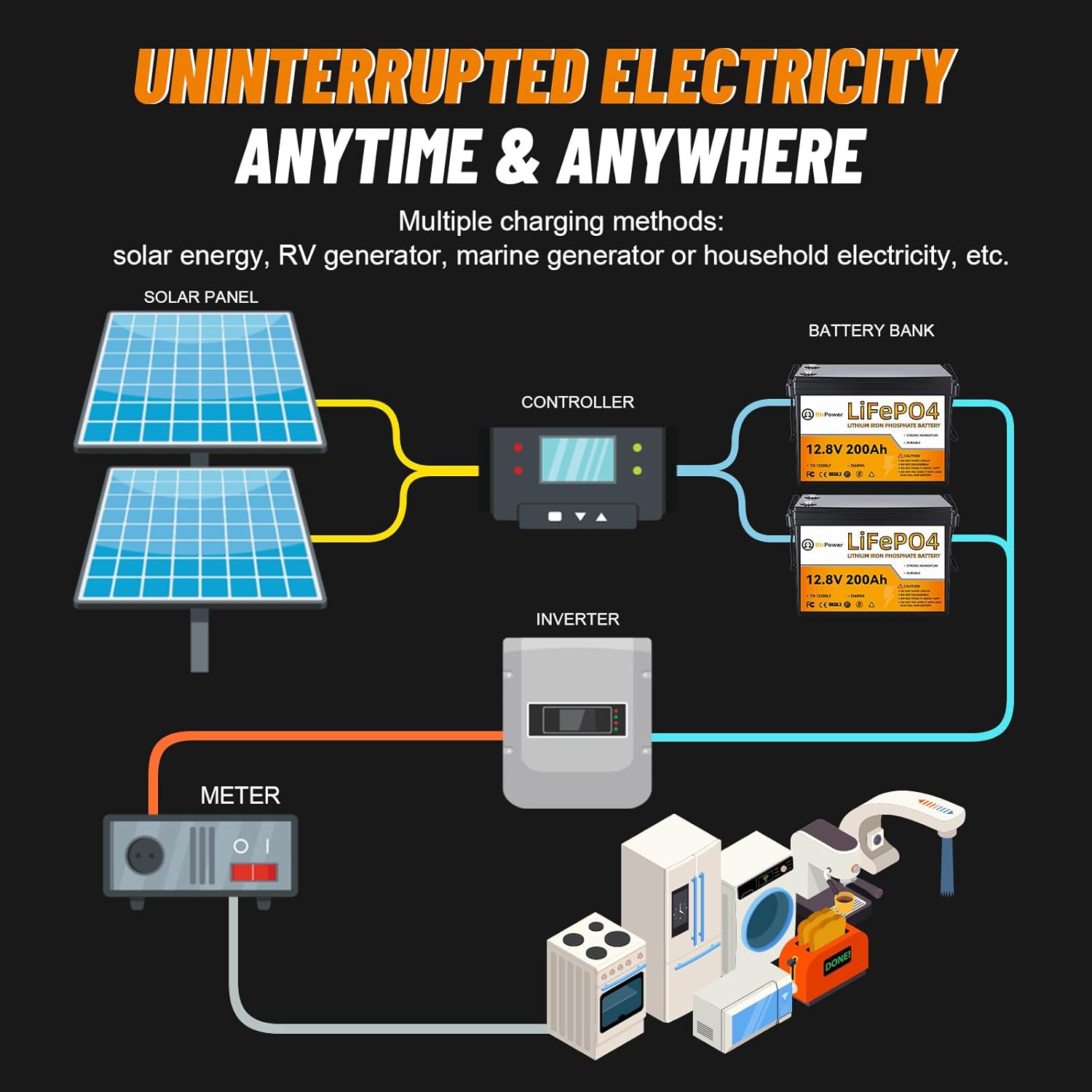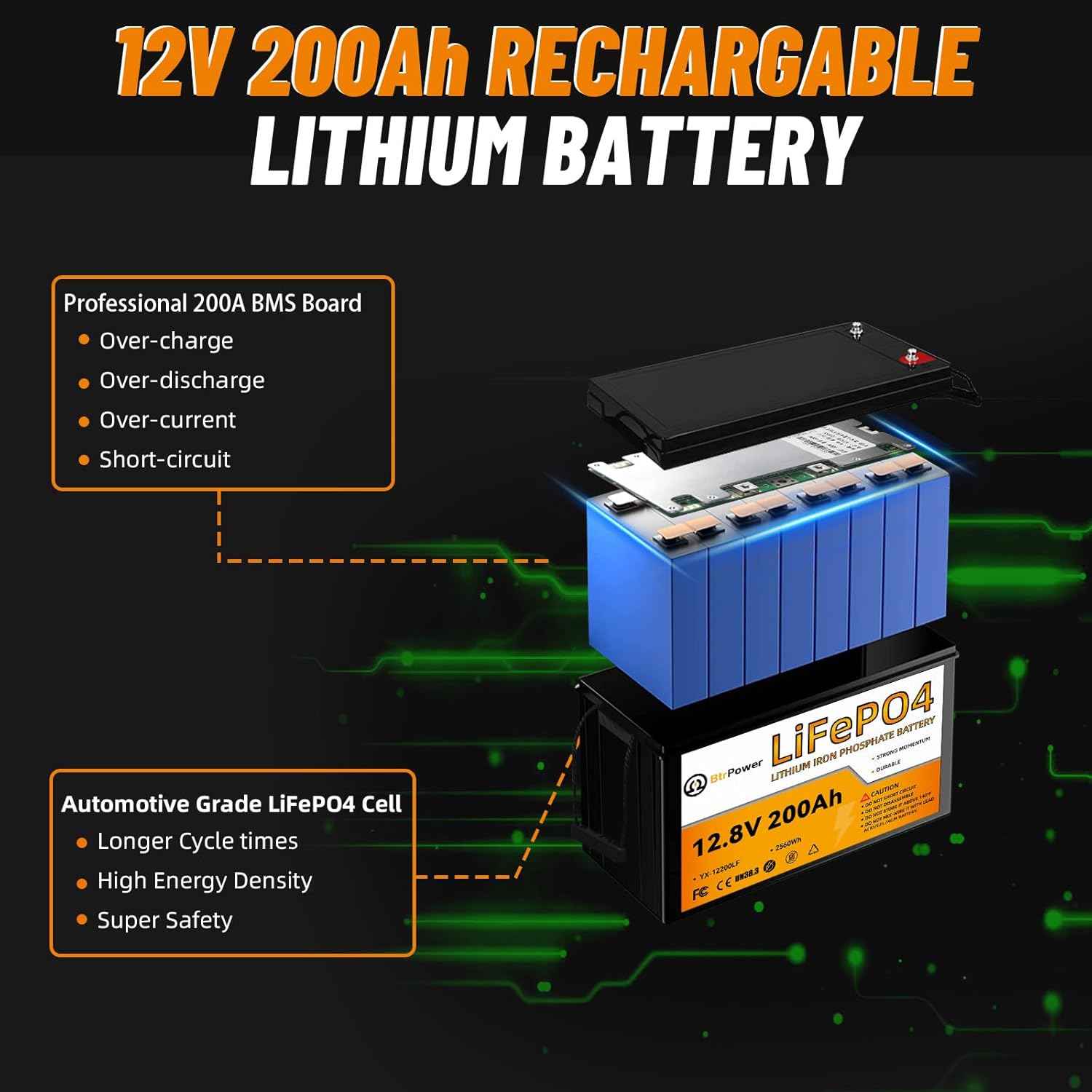 12V 200Ah Lithium Battery LiFePO4 Deep Cycle Battery,100A BMS,4000+ Cycles,Perfect for RV, Home Storage,Marine,Solar Power System and Outdoor Camping. (12V 200Ah)