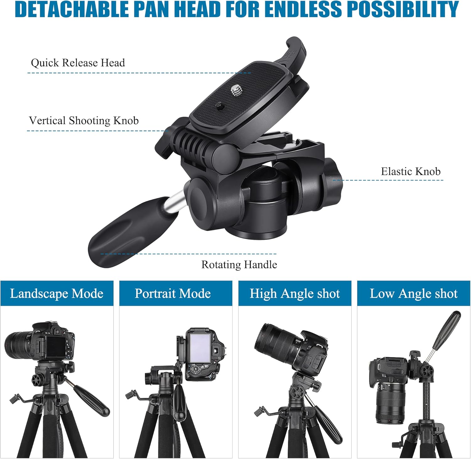 - 【Professional 3-Way Pan Head】VICTIV Professional camera tripod stand is equipped with a stable and smooth 3-way pan head, it allows 360° horizontal panoramic shots, 180° up and down shots, and 90° vertical portraits. Non-slip pads provide great grip. You can also hang a backpack on the weight hook for extra stability
