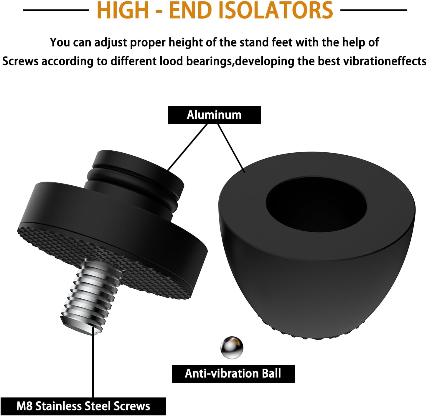 - Versatile Use: These speaker isolation feet are suitable for a wide range of devices, including speakers, amplifiers, instruments, turntables, CD/DVD players, DAC, and more. With a load capacity of max. 200 kg, they effectively prevent the transmission of unwanted resonant frequencies from the relevant enclosure to the stand surface.