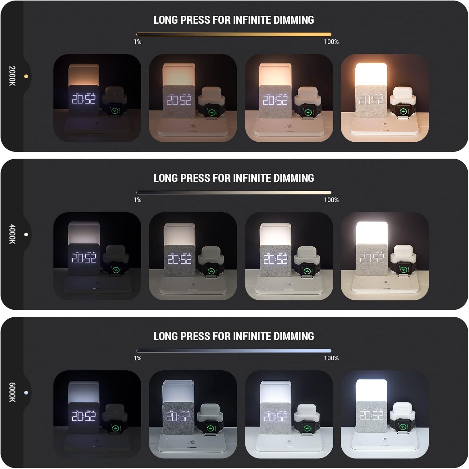 - [Adjustable Upgraded Clock and Lamp] Using smart chip and Built-in battery gives the alarm clock memory function. The alarm clock display has 3 kinds of brightness that can be adjusted and turn off. Don't bother your sleep. Night lights has three color modes(white, warm white, warm) and adjustable brightness (10%-100%). Soft and flicker-free protect your eyes.