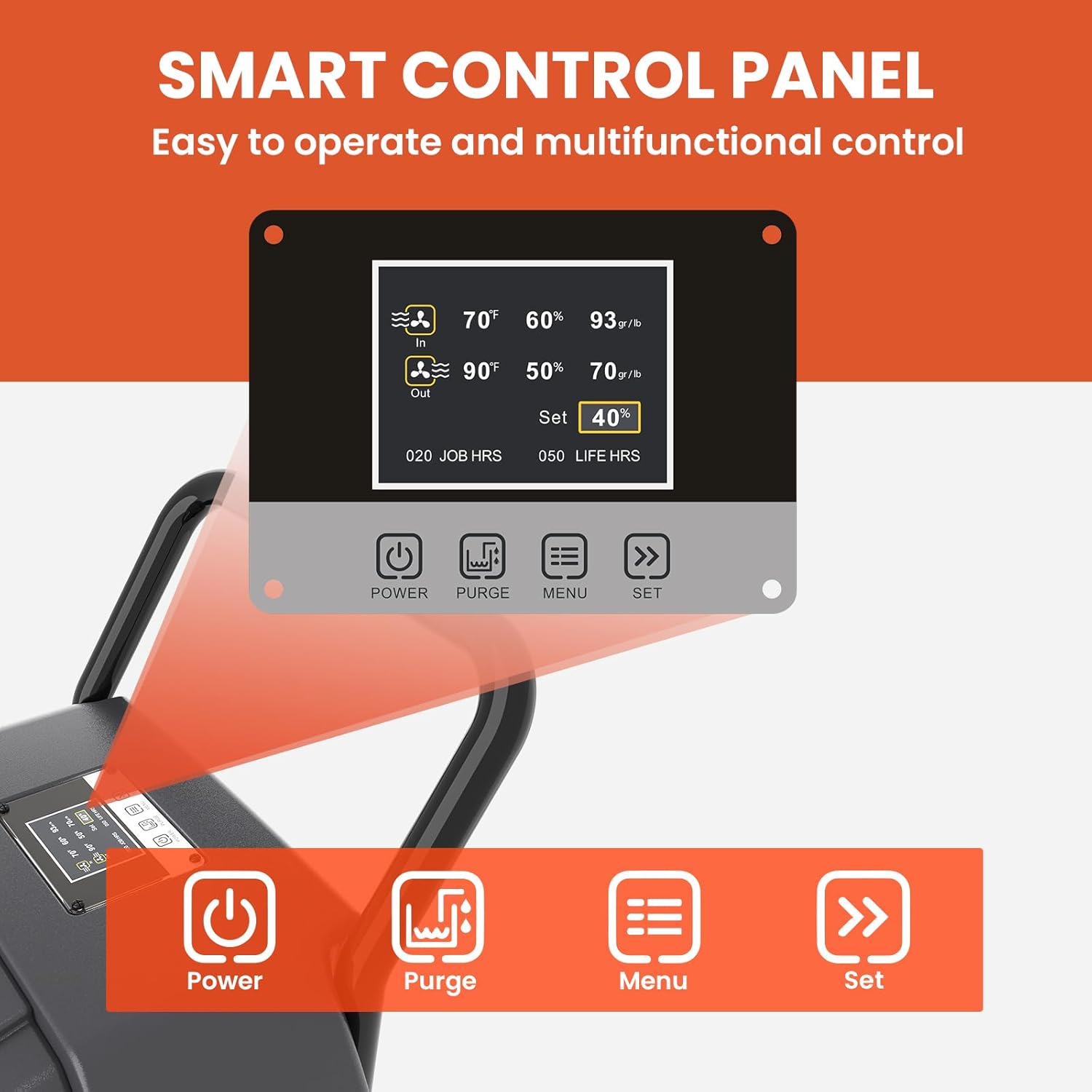 - Smart & User-Friendly: Industrial dehumidifier eatures an auto ON/OFF function, built-in humidity sensor, and digital control panel for precise humidity control. Includes job hours display, auto drain, and auto restart after power outages for hassle-free operation.