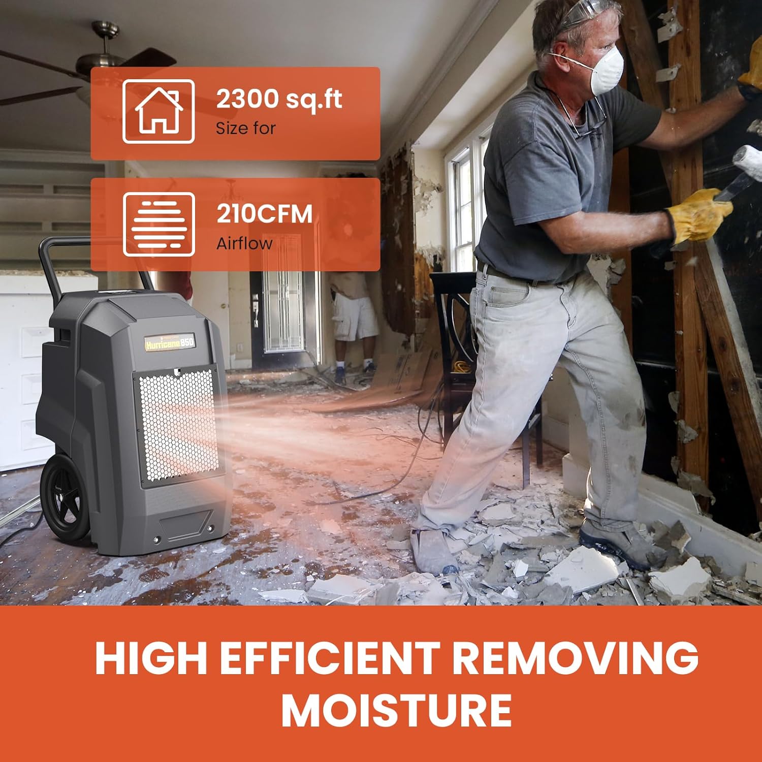 - High-Capacity Dehumidification: This commercial dehumidifier removes up to 180 pints/day at saturation and 85 pints/day at AHAM, covering areas up to 2,300 sq.ft. Ideal for basements, warehouses, construction sites, and flood restoration.