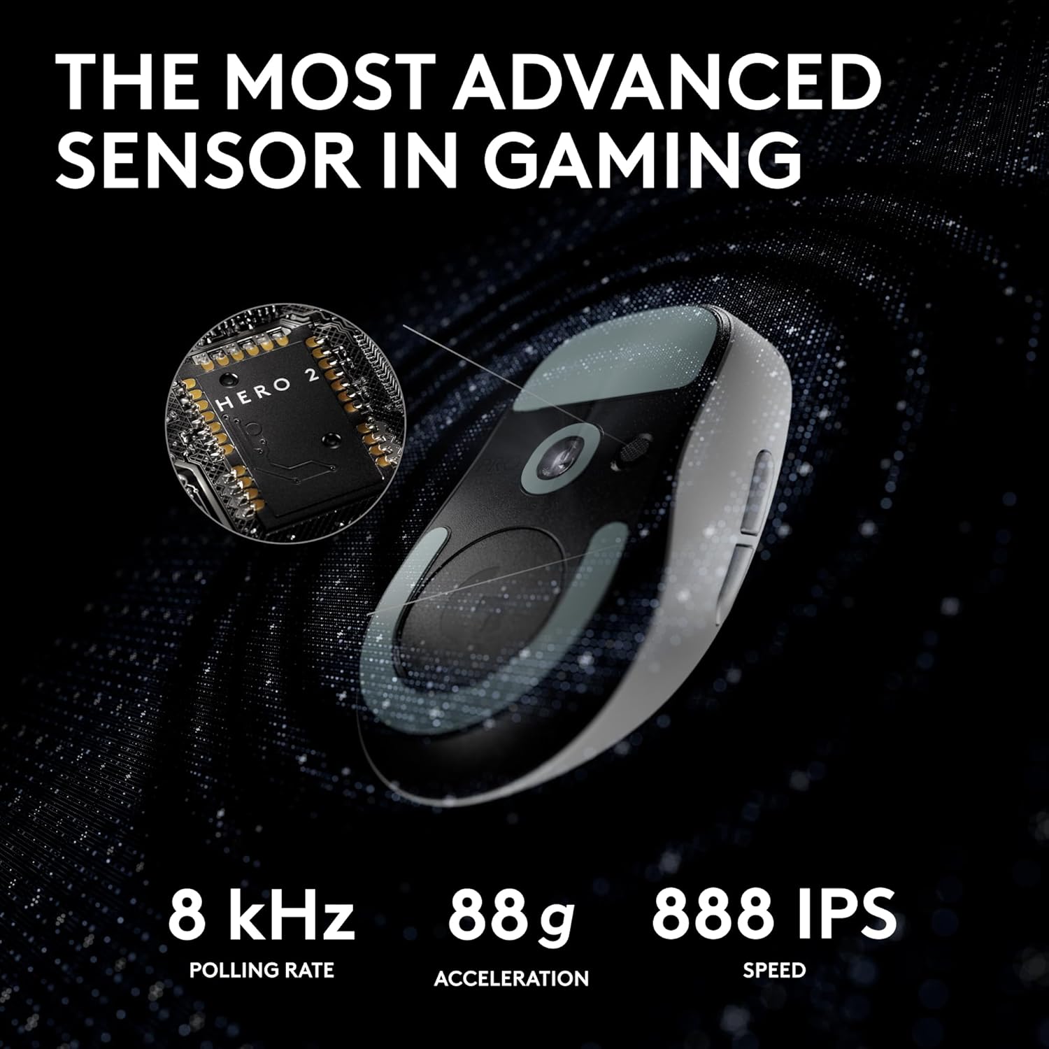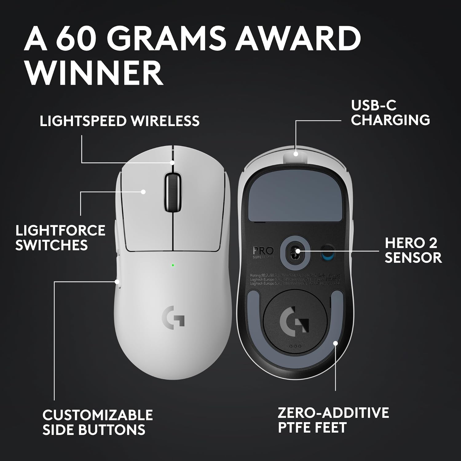 Logitech G PRO X SUPERLIGHT 2 Wireless Gaming Mouse, 60g Pro-Grade with 5 Programmable Buttons, 44k DPI Sensor, 8kHz Report Rate, USB-C Charging for PC/Mac - White