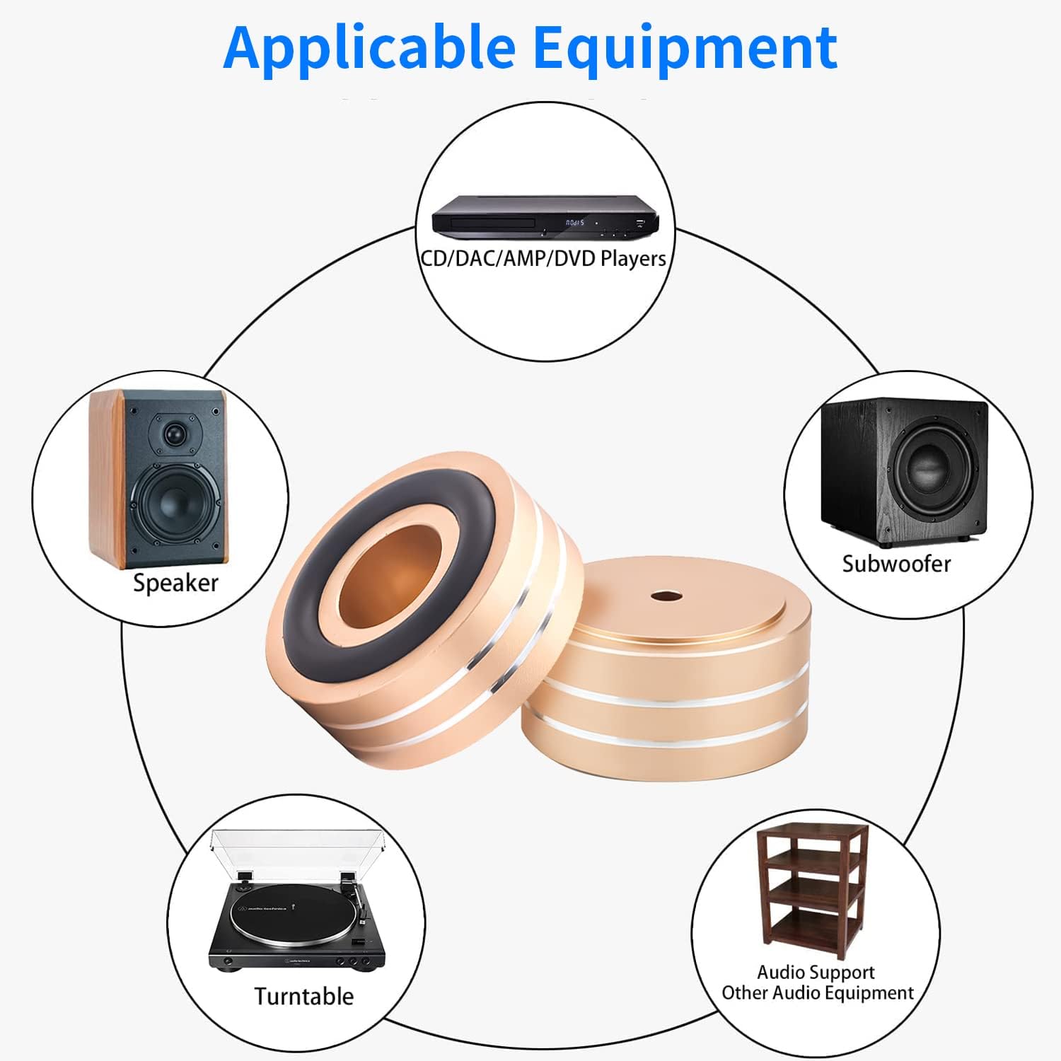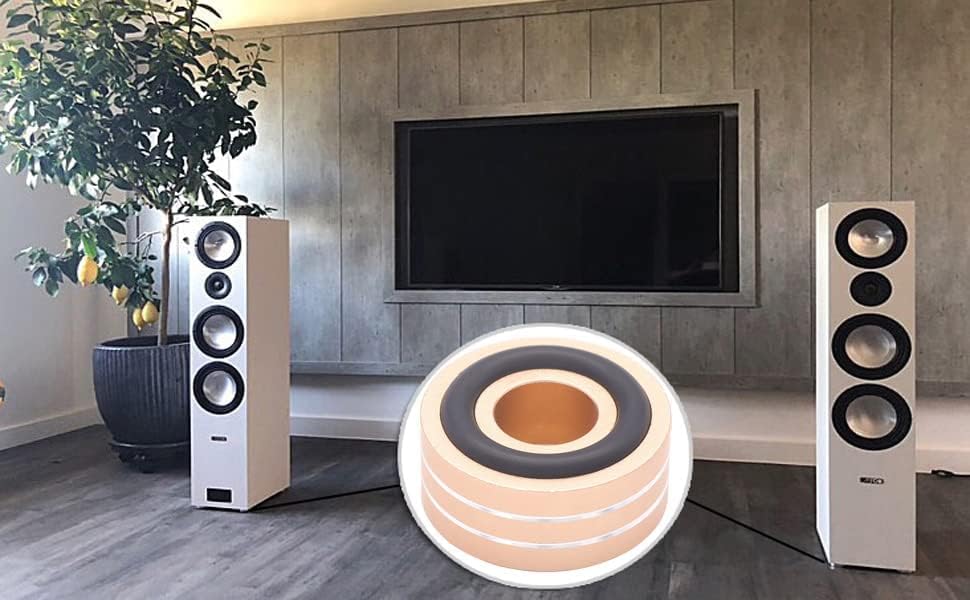- ③ Wide Range of Applications: These isolation feet pads are versatile, suitable for subwoofers, amplifiers, CD/DAC/AMP/DVD players, cassette decks, turntables, and more. They can also be used as isolation feet for PC cases. With a hole diameter of 4.5mm, suitable for M4 screws, each speaker isolation foot can support up to 100kg/220lb, and the set can support around 400kg/880lb.