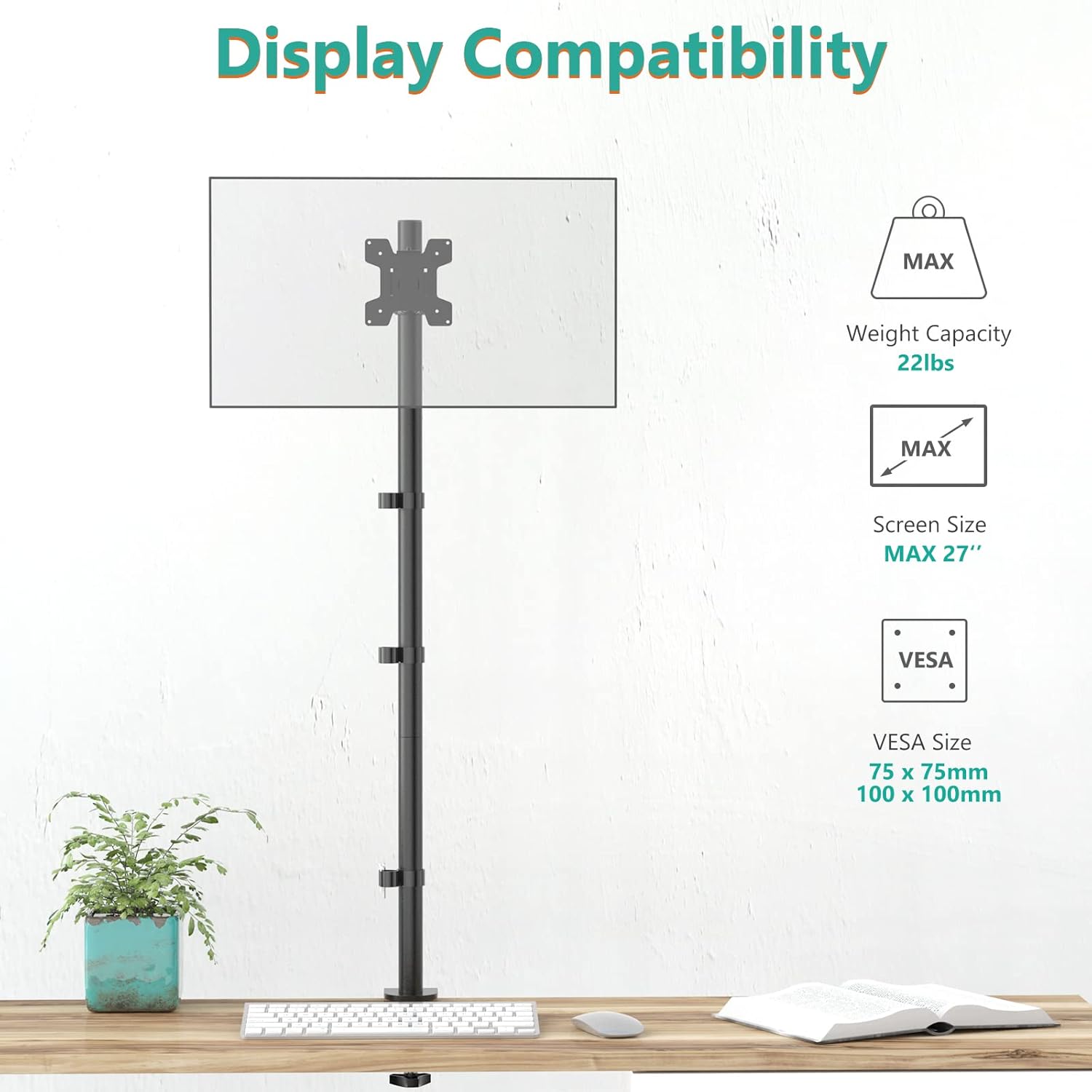- Compatibility: Fits most flat panel monitor up to 32” and supports weight up to 22lbs. Mount plates detachable and height adjustable adapt to mounting holes 75x75mm and 100x100mm