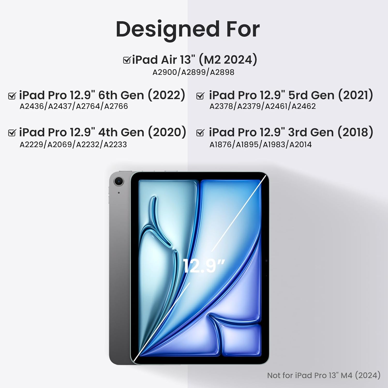 - 【Compatibility】ONLY compatible with iPad Pro 12.9 inch 6th Generation 2022 (Model Number: A2436, A2764, A243, A2766); 5th gen 2021 (Model : A2378, A2379, A2461, A2462); 4th gen 2018 (Model : A1876,A2014,A1895,A1983); Note: Please check the model number "AXXXX" on the back of your iPad before purchasing to avoid size errors