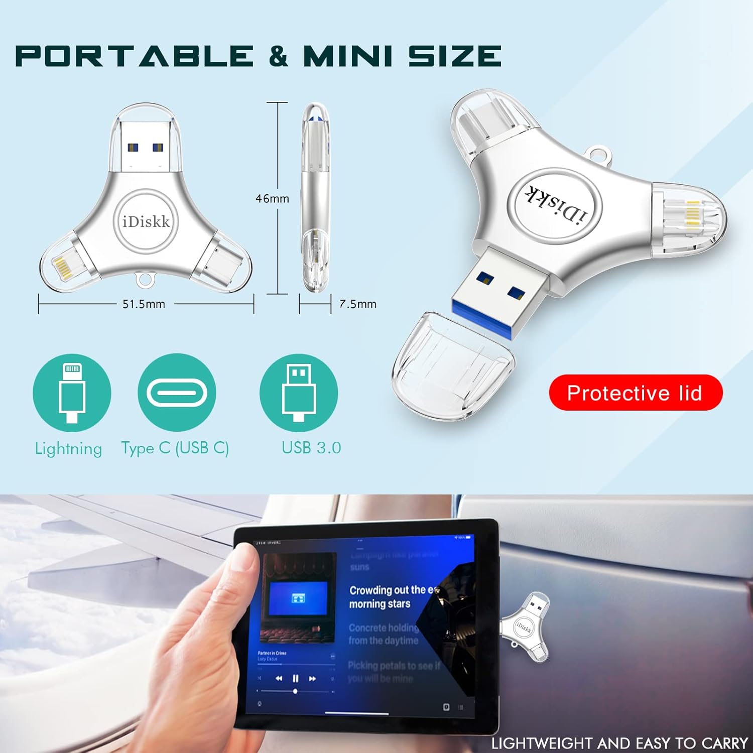 - ✔【3 in 1 Multifunctional MFi Certified Photo Stick for iPhone,suppport iOS/Android/WIndows/OS system】 - the iDiskk iPhone photo stick fit all your devices with lightning Connector, USB-C Connector and USB 3.0 Connector for versatile devices: Lightning connector is for iOS devices including iPhone and iPad;USB 3.0 connector is for PC/Mac/iMac; USB-C connector is for Android phones/Macbook Pro and other USB-C devices(Can work with iPad Pro with USB-C port ).