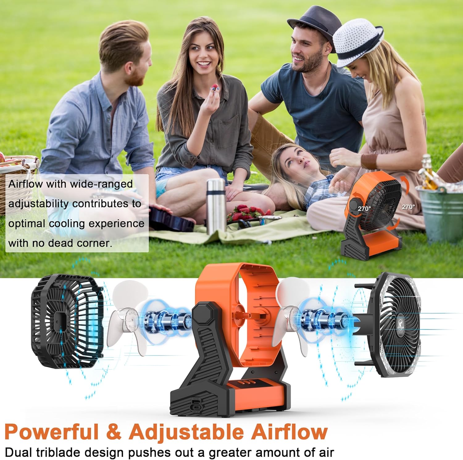 - DOUBLE TRIBLADE & 270° PIVOT: The camping fan with double triblade design to put on more powerful airflow than the ordinary others. Plus 4 different speeds to meet your different demands. A 270° pivoting head enables to cool you down instantly in whichever direction you like