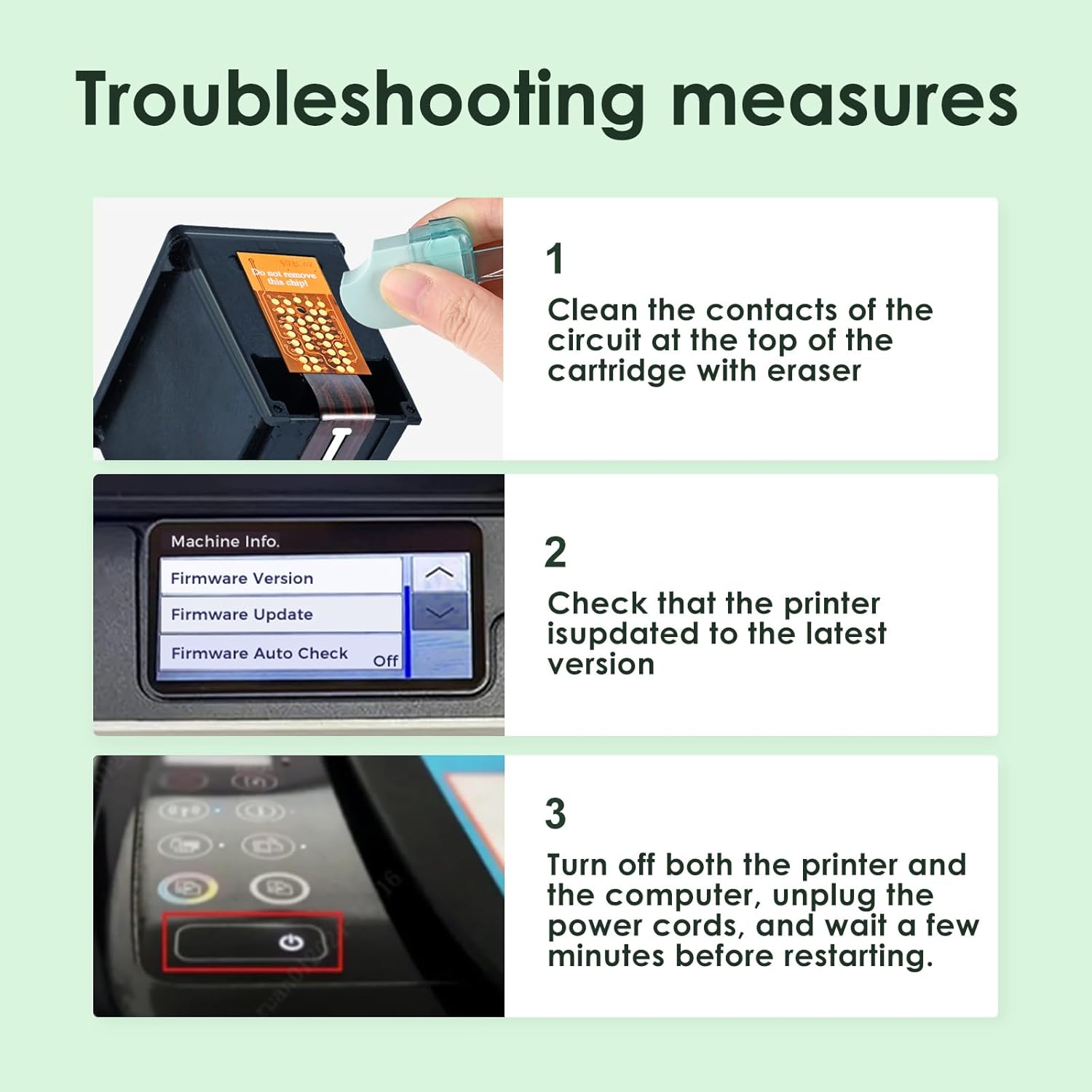 - Troubleshooting measures: If your printer has an error message, you can try to solve it with the following methods 1.Clean the contacts of the circuit at the top of the cartridge with eraser 2. Check that the printer isupdated to the latest version 3. Turn off both the printer and the computer, unplug the power cords, and wait a few minutes before restarting.