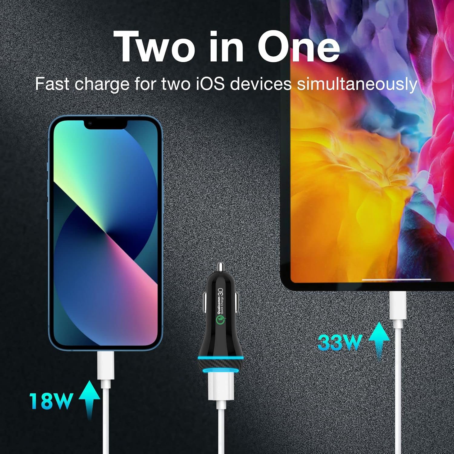 - Dual-Port Fast Charging On the Go: This USB C car charger features 1 USB-C port + 1 USB-A port, allowing you to charge two devices at once with a combined 51W output. USB-C Port: Delivers up to 33W with Power Delivery (PD), perfect for fast-charging iPhones, Samsung Galaxy, and other PD-compatible devices. USB-A Port: Supports Quick Charge 3.0 (up to 18W), ideal for Android phones, tablets, and other QC-enabled gadgets. Works with most smartphones and devices—whether you're powering up your iPhone, Android, iPad, or even a portable fan, this car charger keeps you running at full speed