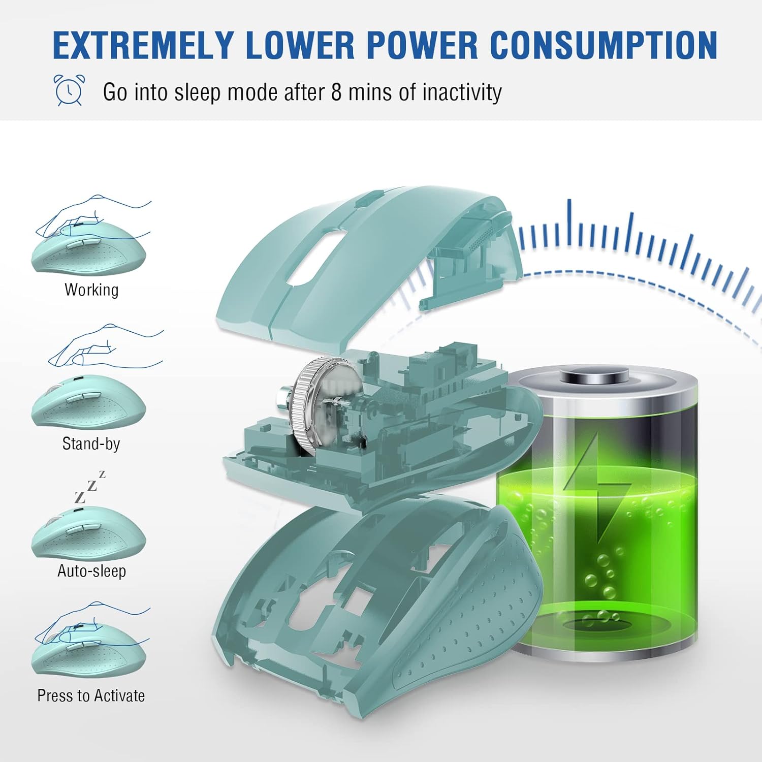 - ✅ 18 MONTHS BATTERY LIFE & POWER SAVING MODE: E-YOOSO Wireless mouse with 18 months battery life. The wireless mouse with smart auto sleep mode, when lower power consumption, the mouse will enter the automatic sleep state to save power if you don‘t use it for 8 minutes,then click mouse runs on again.