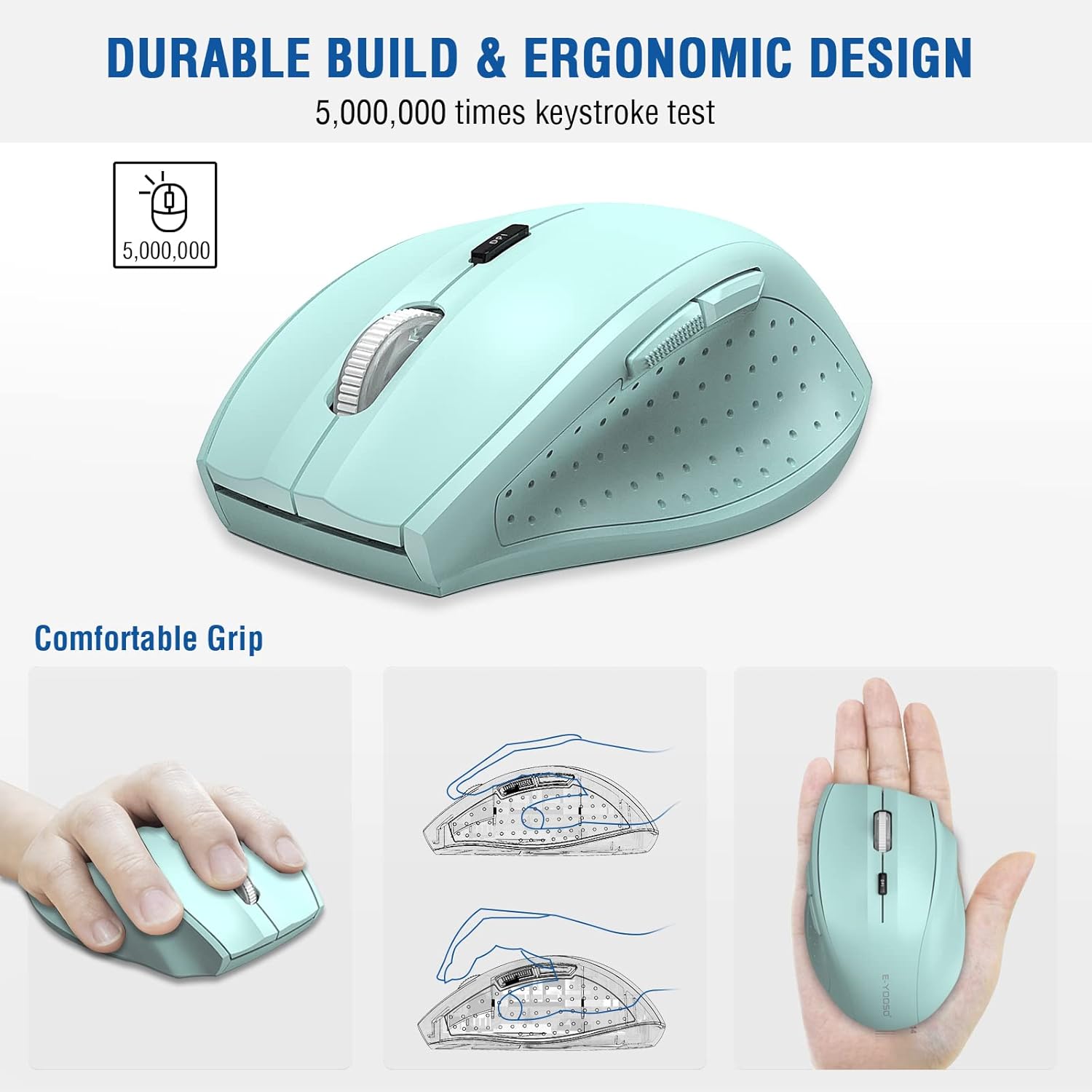 - ✅ ANTI-SLIP & ANTI-SWEAT ERGONOMIC DESIGN: E-YOOSO Ergonomic Mouse is made of anti-slip and anti-sweat custom material, super durable. E-1010 Ergonomic PC mouse with backward and forward button, make your web surfing more efficient, and perfect performance for more than 5,000,000 keystrokes!