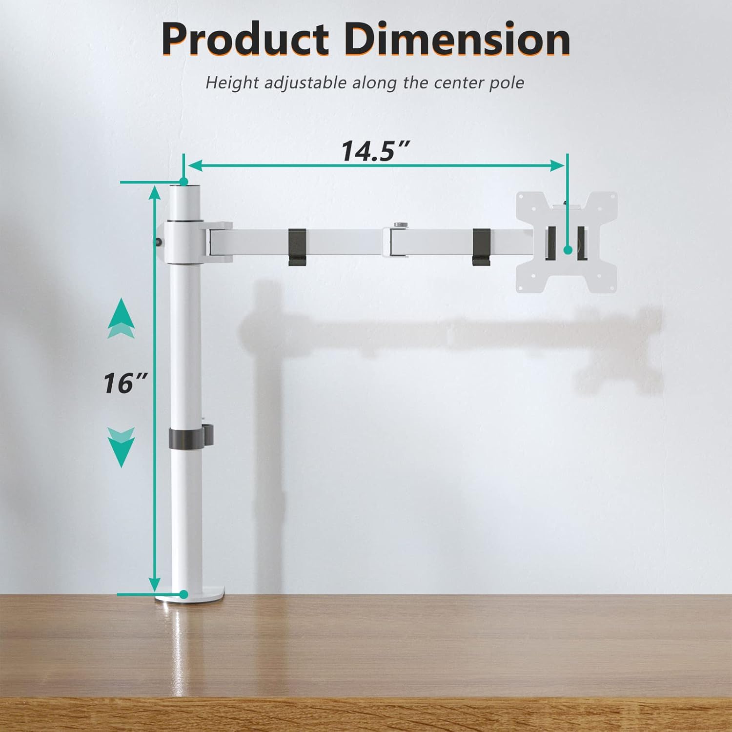 - Double Benefits: Monitor arm is easily adjustable on the 16” height pole. Double efficiency and productivity by opening up desk space allow working in a more comfortable, ergonomically correct position to reduce neck and eye strain.