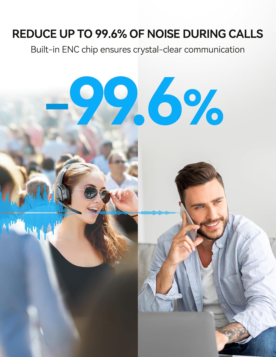- INDUSTRY-LEADING NOISE CANCELLATION: Eliminating up to 99.6% of background noise. Wireless headset with mic for work utilizes the latest noise cancellation technology to ensure clear and crisp voice transmission from any location