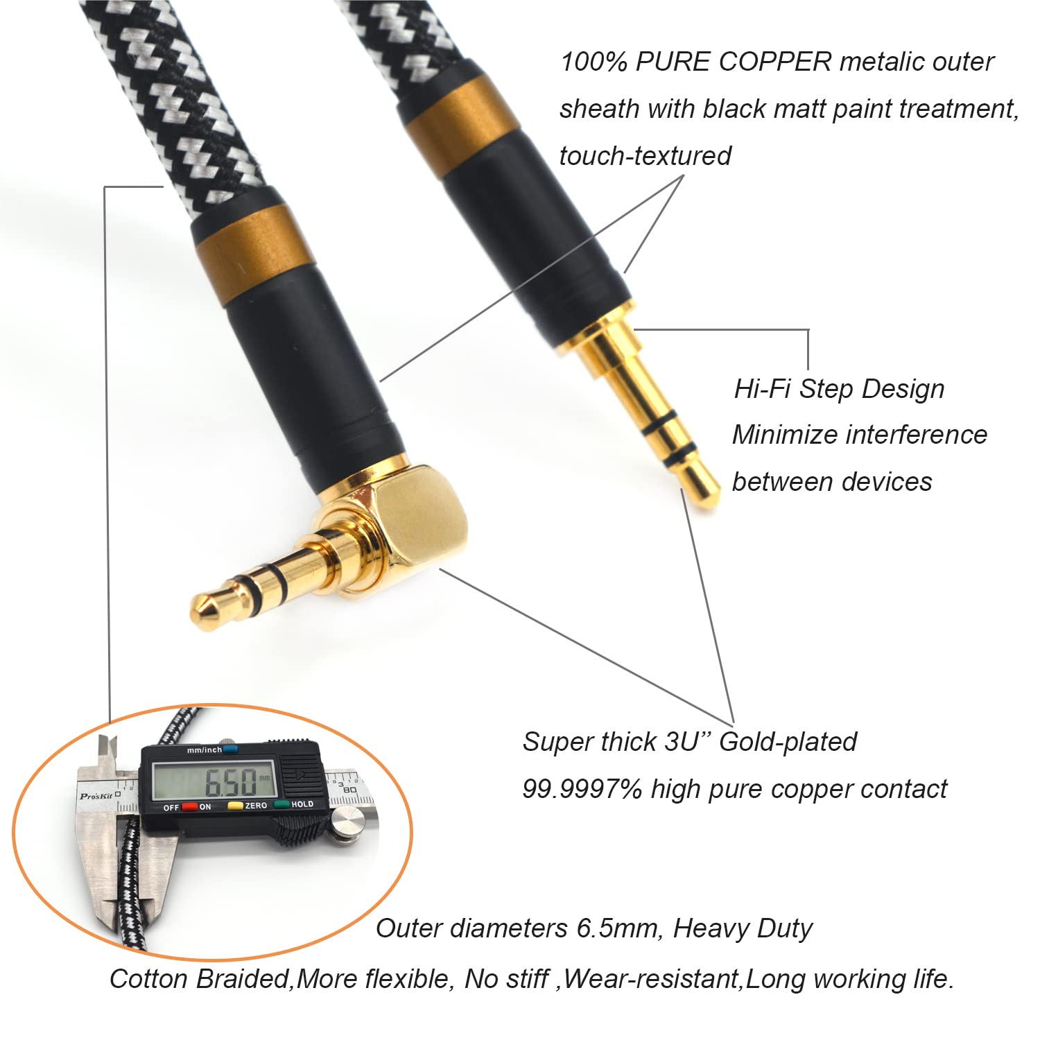 Aux Cord, Audiophile 3.5mm Stereo Audio Cable [0.75m (2.5 Feet), Silvered-Plated Copper core, Right Angle] Unbreakable and Great for Laptop, Tablets,Headphones, Cars and More.