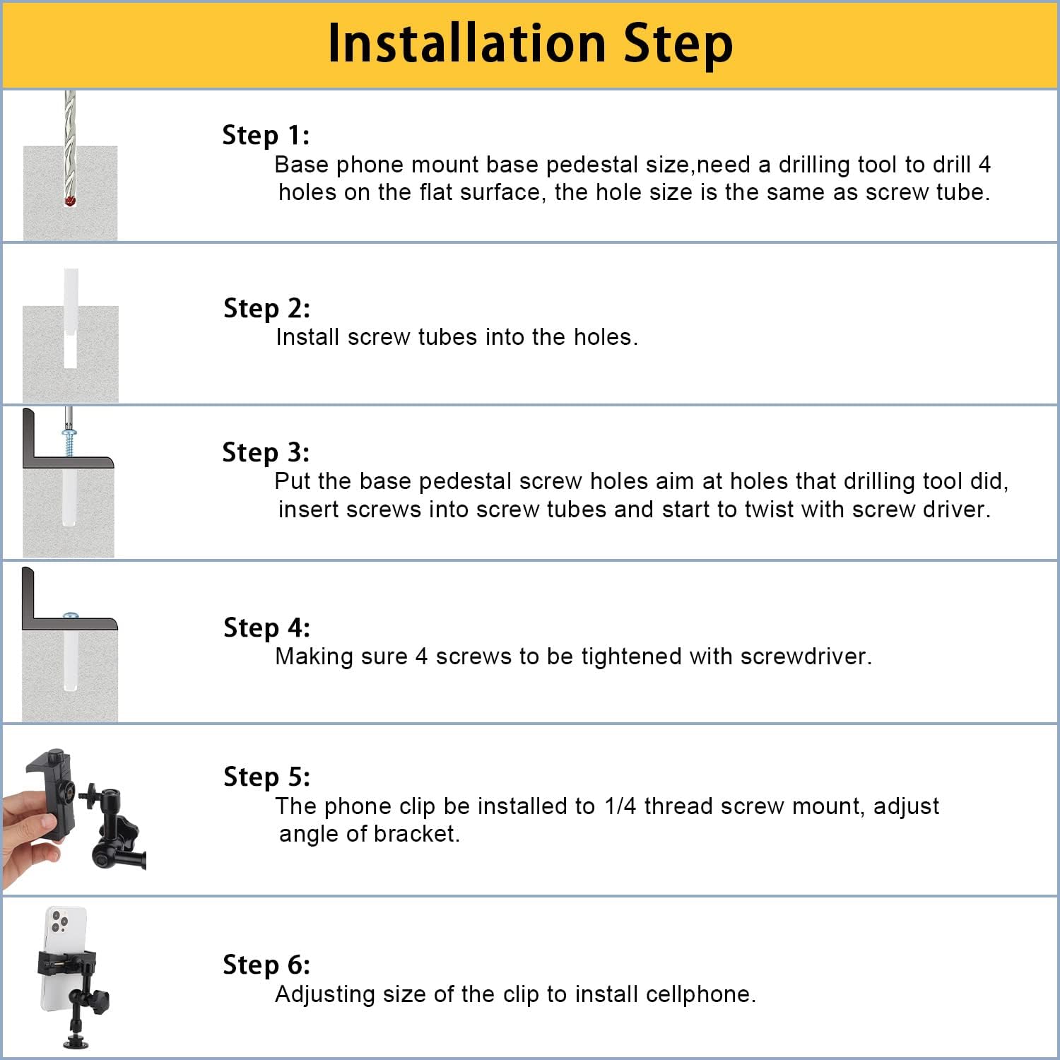- 【Installation】:Phone mount arm length is 155 mm/6.1 inch, base pedestal diameter is 4cm/1.57 inch,phone stand design to drill 4 holes base pedestal mount, being installed on these flat surfaces: wooden board,wall,desk,counter,railing and ceiling etc,works in truck,car,van,boat,commercial vehicles dashboard, it’s easy for driver to install on the place where they need with screws.