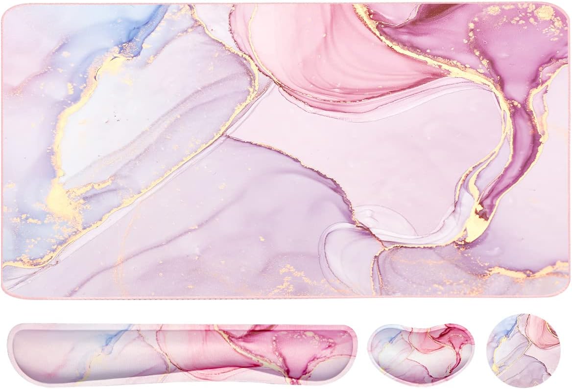 Keyboard Mouse Pad Set, Extended Mouse Pad+Keyboard Wrist Rest Support, Memory Foam Ergonomic Easy Typing, 3Pcs (35.4×15.7 in) Desk Pad Set for Home Office Study Game- Pink Marble