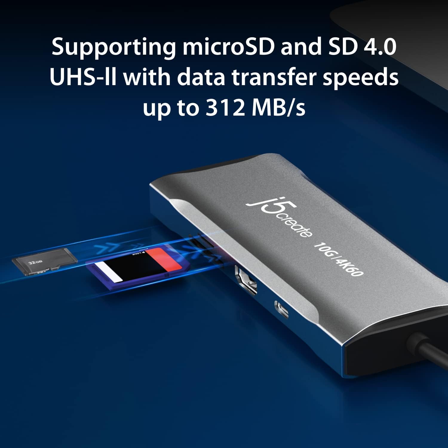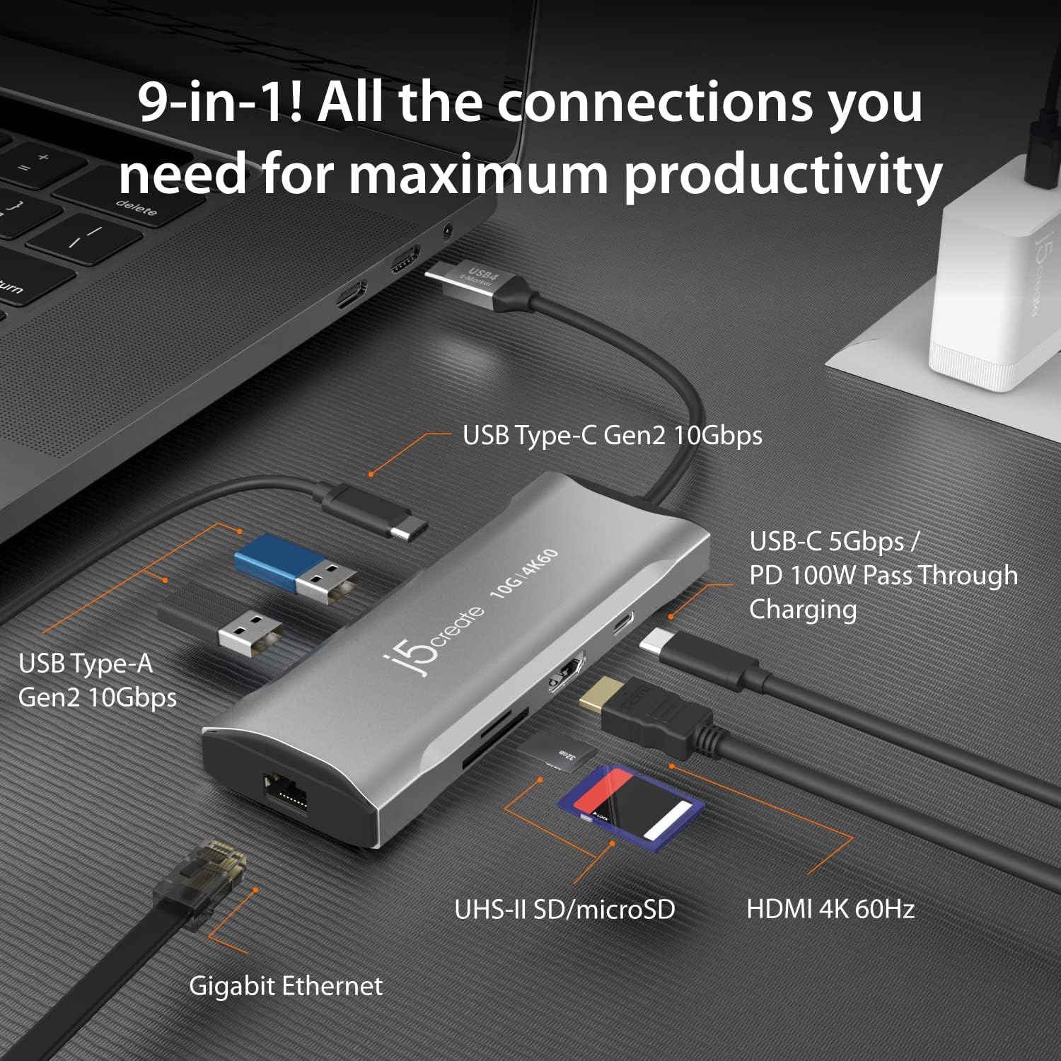 j5create Laptop Docking Station, 9-in-1, 4K60Hz HDMI, USB-C 10Gbps, 2 USB-A 10Gbps, 100W PD with USB-C 5Gbps, Ethernet, SD 4.0 Card Reader, for MacBook, XPS, Surface Pro (JCD393)