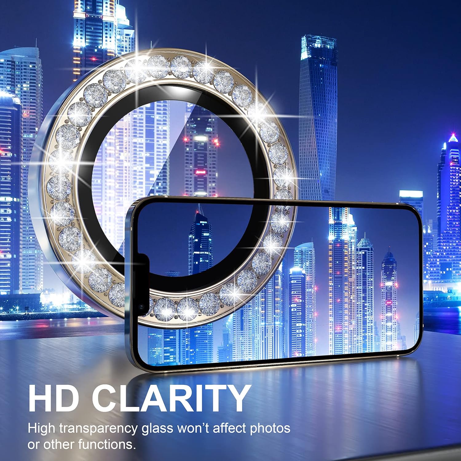 - Personalized Decoration: Made of high-quality aviation aluminum metal ring and 9H tempered glass and inlaid with bling rhinestones to give your iPhone 13 Pro/Pro Max camera lens a diamond gorgeous appearance, shining in the sun, very eye-catching and complimentary.