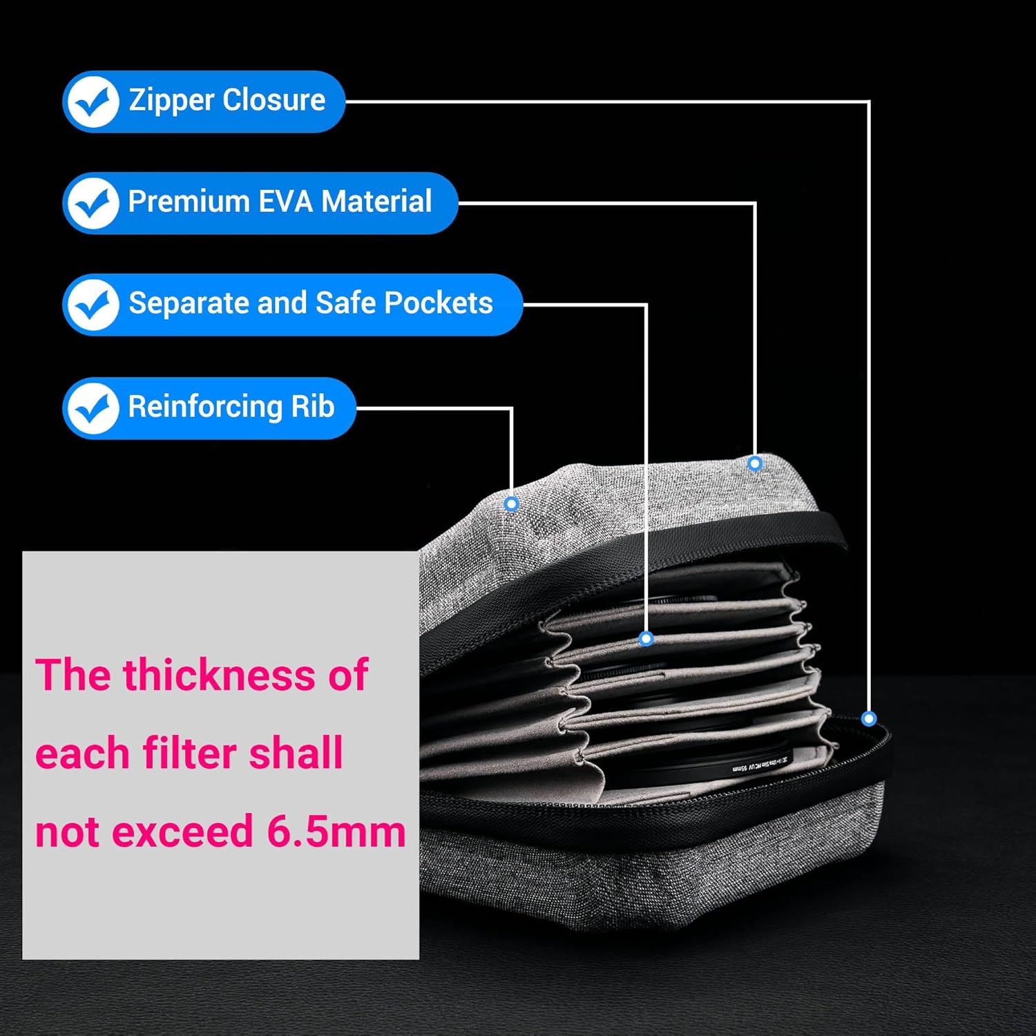 - 【WATER RESISTANT & DUSTPROOF & SHOCKPROOF】:The pouch is made of EVA+Polyester,protects your filters from dust, shock, and water splashing.