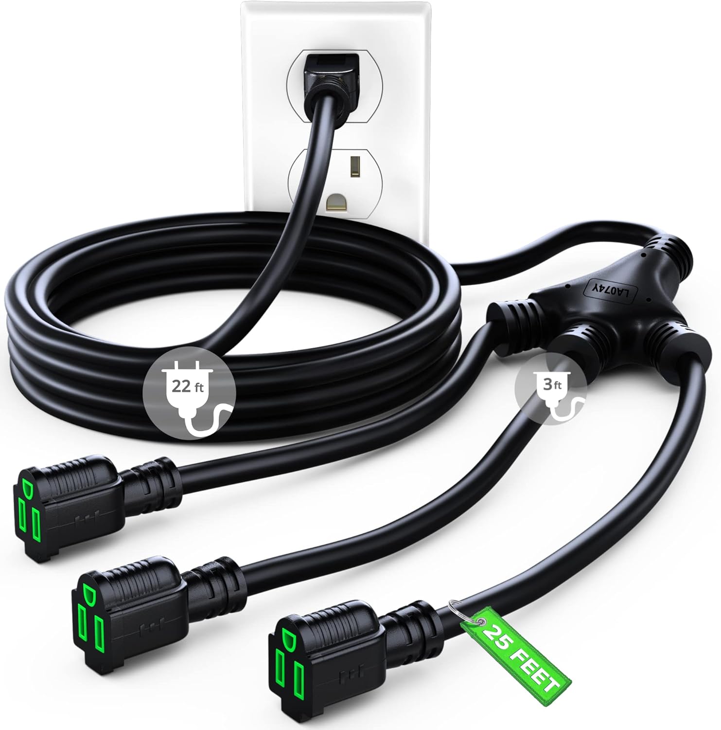 - Extension Cord Heavy Duty Splitters 25ft. Main cord length: 19ft, branch cord length: 6ft, crafted with PVC jacket, 12-gauge copper Wires, water-resistant outdoor extension cord. SJTW rating meaning the cord is extremely tough and can resist tearing, abrasion, moisture and exposure to sunlight (avoid the plug and the outlet from getting wet)