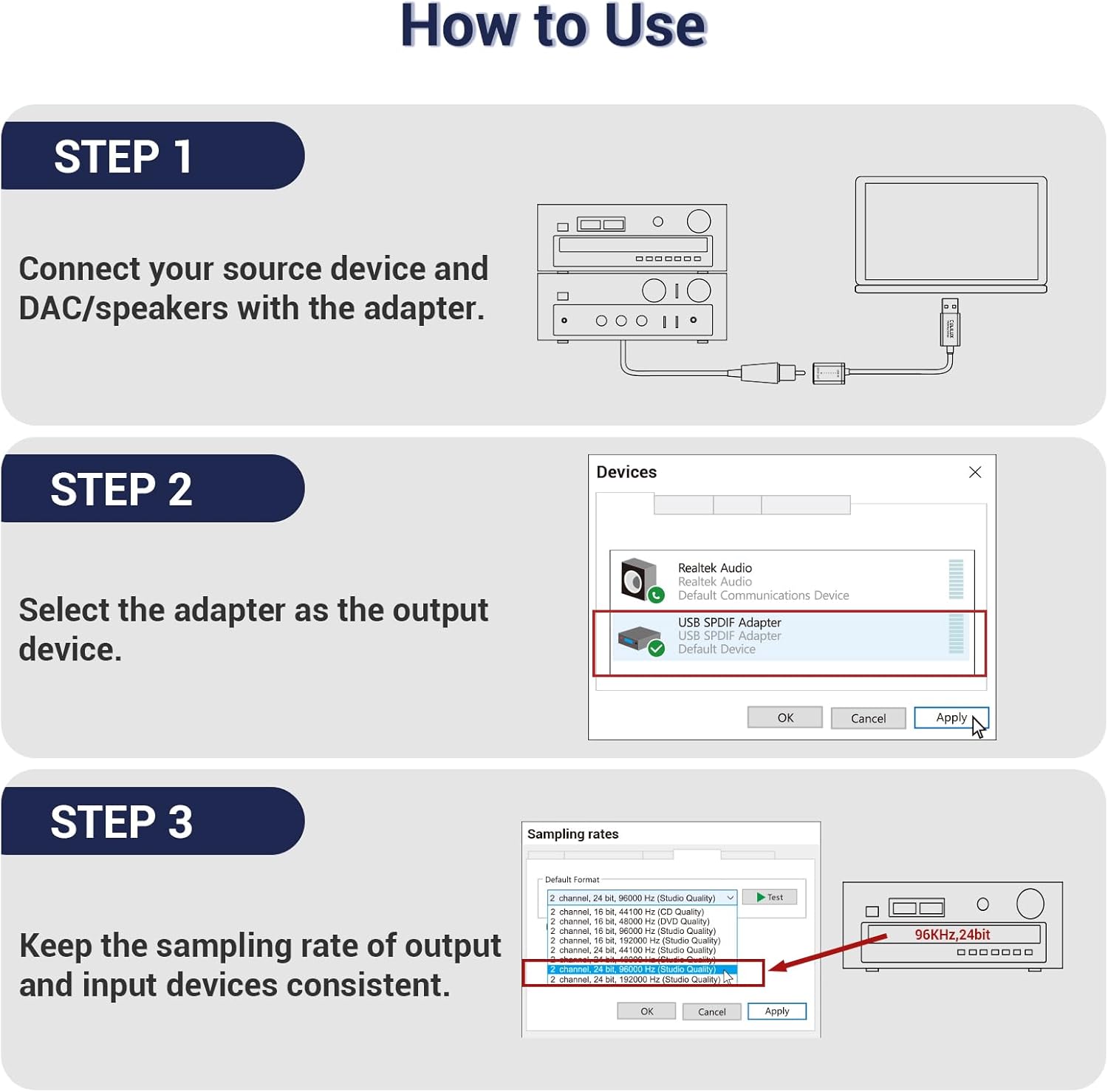 - [Crystal Clean Hi-Res Sound] – The USB Type A to TOSLINK Connector delivers crisp and clear High-Resolution sound at 48KHz/24-bit, 96KHz/24-bit, 192KHz/24-bit with great clarity and rich audio details.