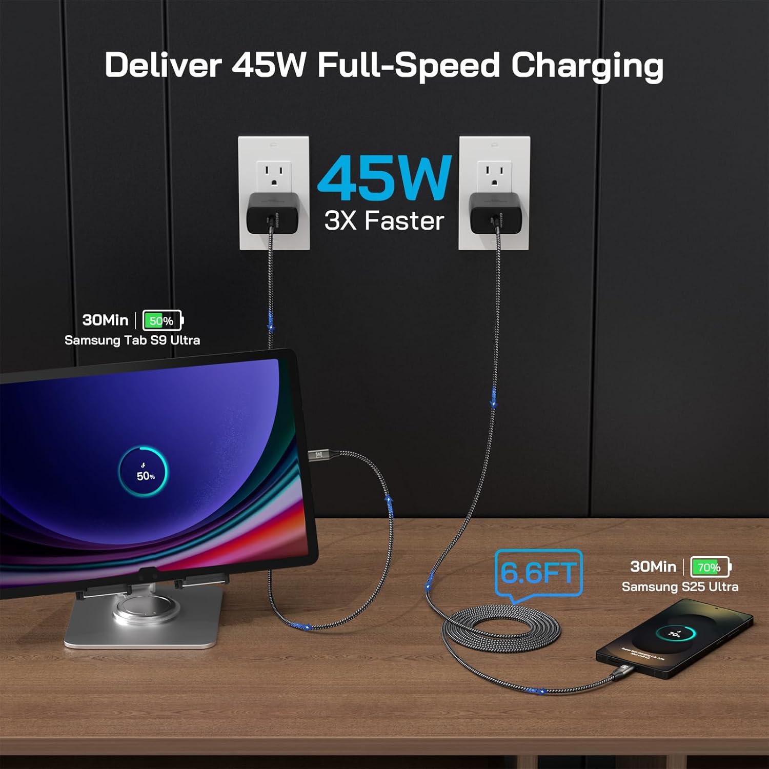 - 【One Fits All】- This portable 45W USB-C Charger pack broadly fits almost any personal devices from phones, tablets to laptops, and especially, provides optimized charging for Samsung, [45W Super Fast Charging 2.0]: for Samsung Galaxy S25 Ultra/S25+/S24 Ultra/S24+/S23 Ultra/S23+/S22 Ultra/S22 Plus/S20 Ultra/Note 10+, Galaxy Tab S8/Ultra; [25W Super Fast Charging 1.0]: for Samsung Galaxy S25/S24/S23/S22/S21+/S21 Ultra/FE/S20+; [PD Fast Charging]: Mac Book, i Pad, i Phone, Switch, for Steam Deck..