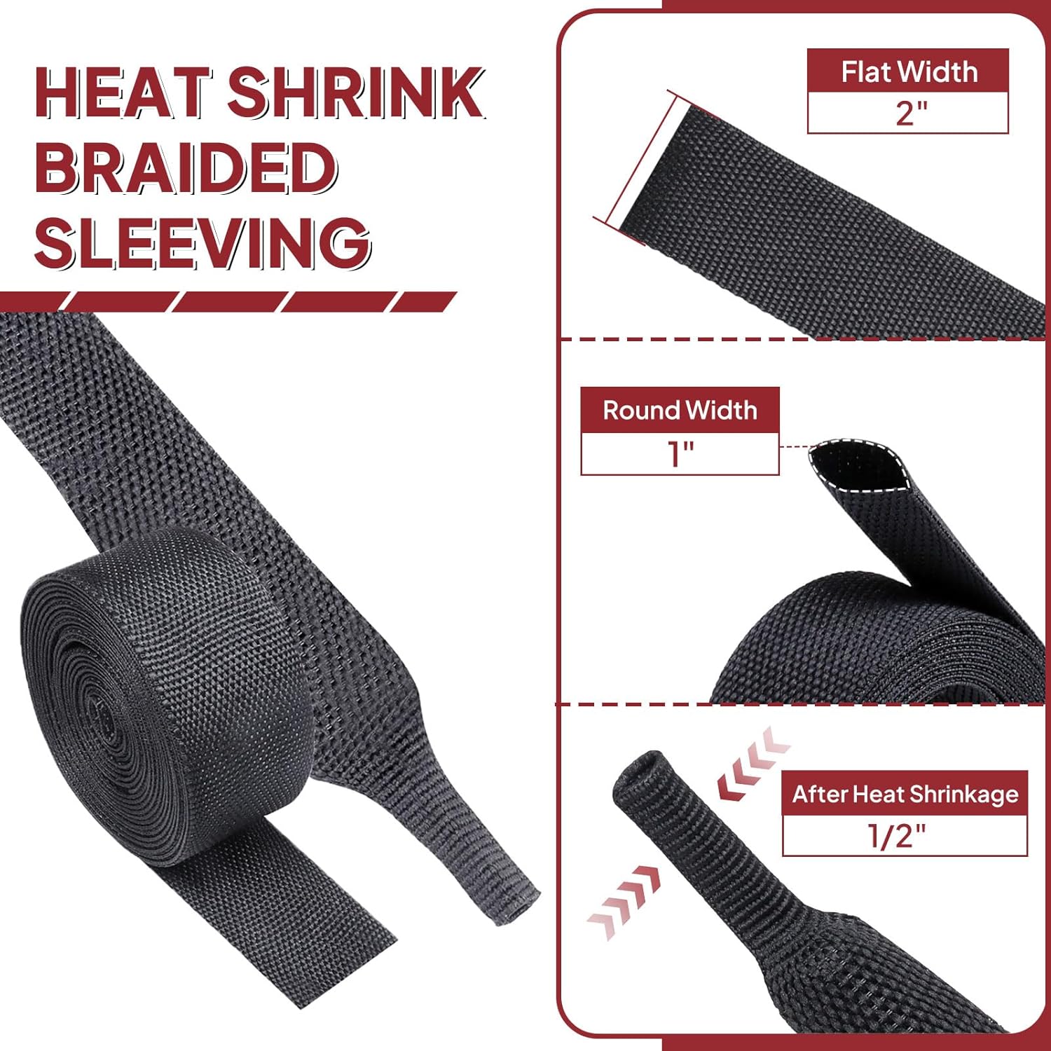 - Size : Flat Width: 2" ; Inner diameter before shrink 1"; braided sleeving wire sheathing require a bit more heat to shrink needs to use a heat gun to shrink and shrink evenly(Gets a bit stiff when heated)