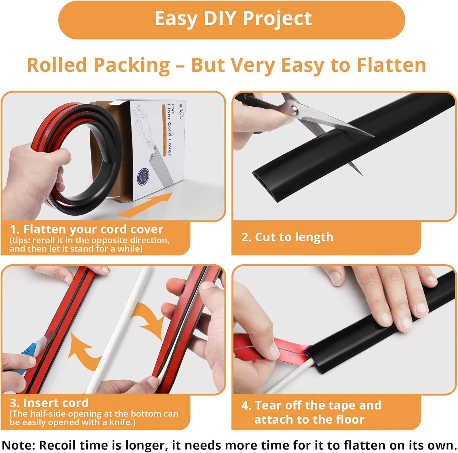 - Quality Cord Concealer Floor: Made of flexible PVC, coiled packing, but very easy to flatten. No boiling water is needed to uncoil it; just reroll it in the opposite direction and let it stand for a while