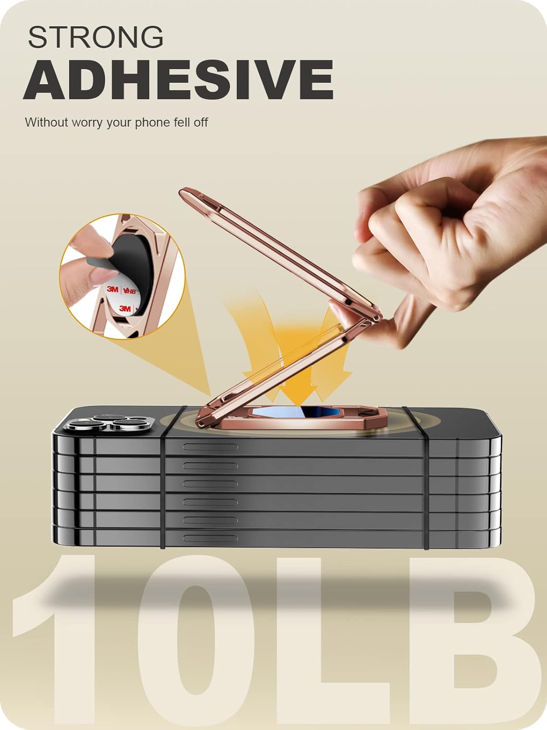 - ใ2025 New Version 3M Tape to Guard Your Phoneใ This iphone kickstand employs 2025 new version 3M tape. This strong tape ensure it sticks tightly to your phone and hold it strongly to reduce the risk of dropping it from your hand accidentally. As usual, keep your collapsible iphone ring holder grip functions like text or selfie with one hand. It will take 100% effect after 48 hours in the first stick and it will leave no adhesive residue on your phone after you removed it.
