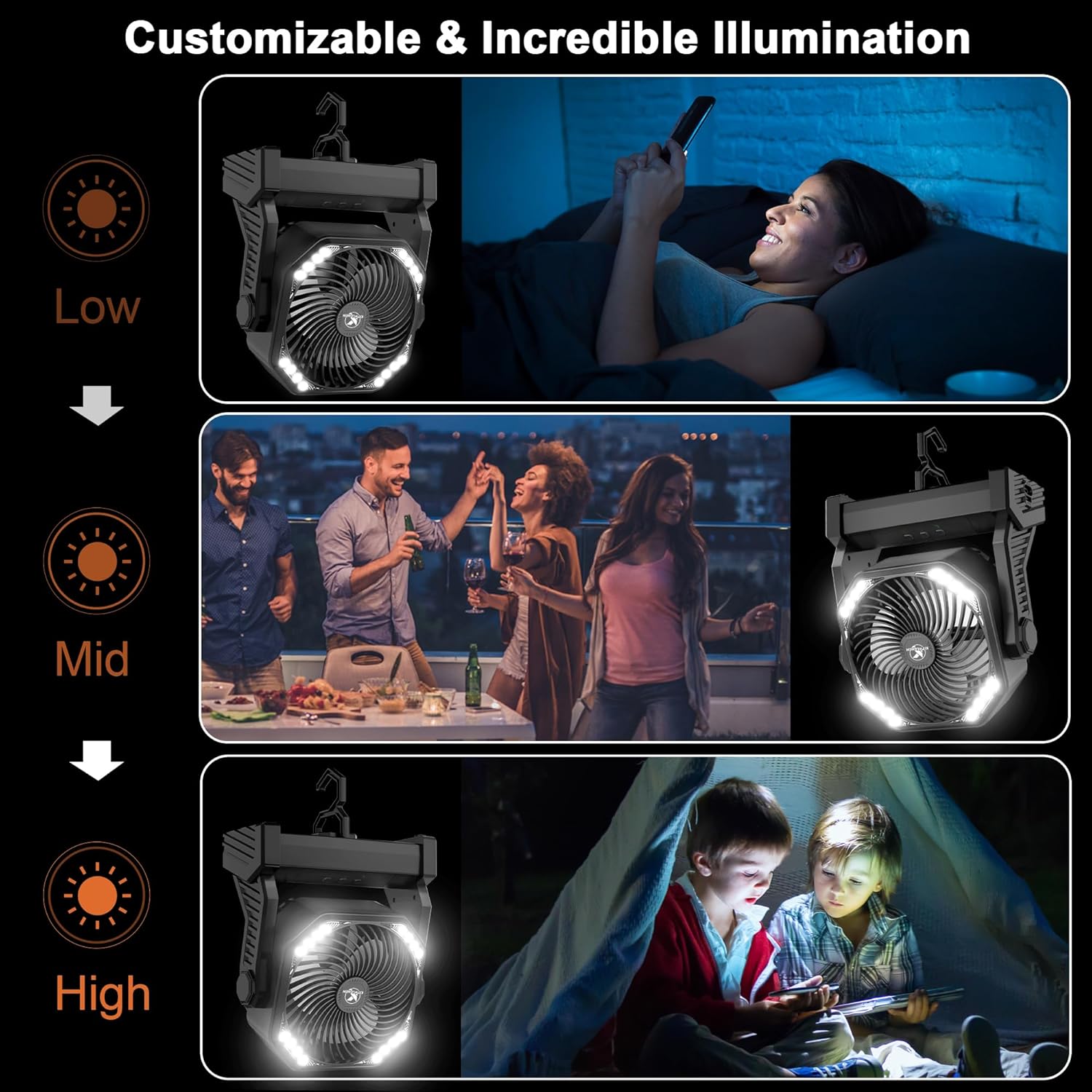 - 20000mAh RECHARGEABLE BATTERY: Powered by 20000mAh rechargeable battery, it can be fully charged in 8-9 hours with 5V3A input via 5V/3A Type-C port, and provide 58 hours cooling on low speed—ideal for extended camping trips, power outages, or emergencies. The Type-C & USB output ports also charge phones, making it a versatile camping power bank
