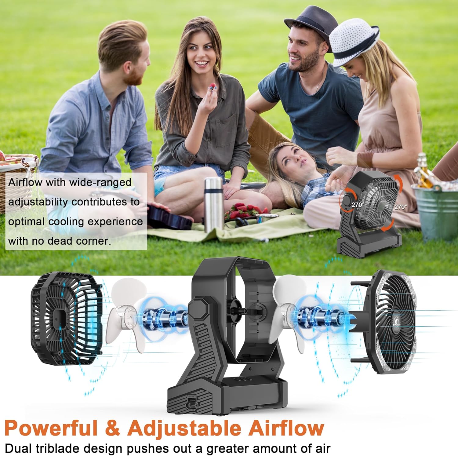 - DOUBLE TRIBLADE & 270° PIVOT: The camping fan with double triblade design to put on more powerful airflow than the ordinary others. Plus 4 different speeds to meet your different demands. A 270° pivoting head enables to cool you down instantly in whichever direction you like