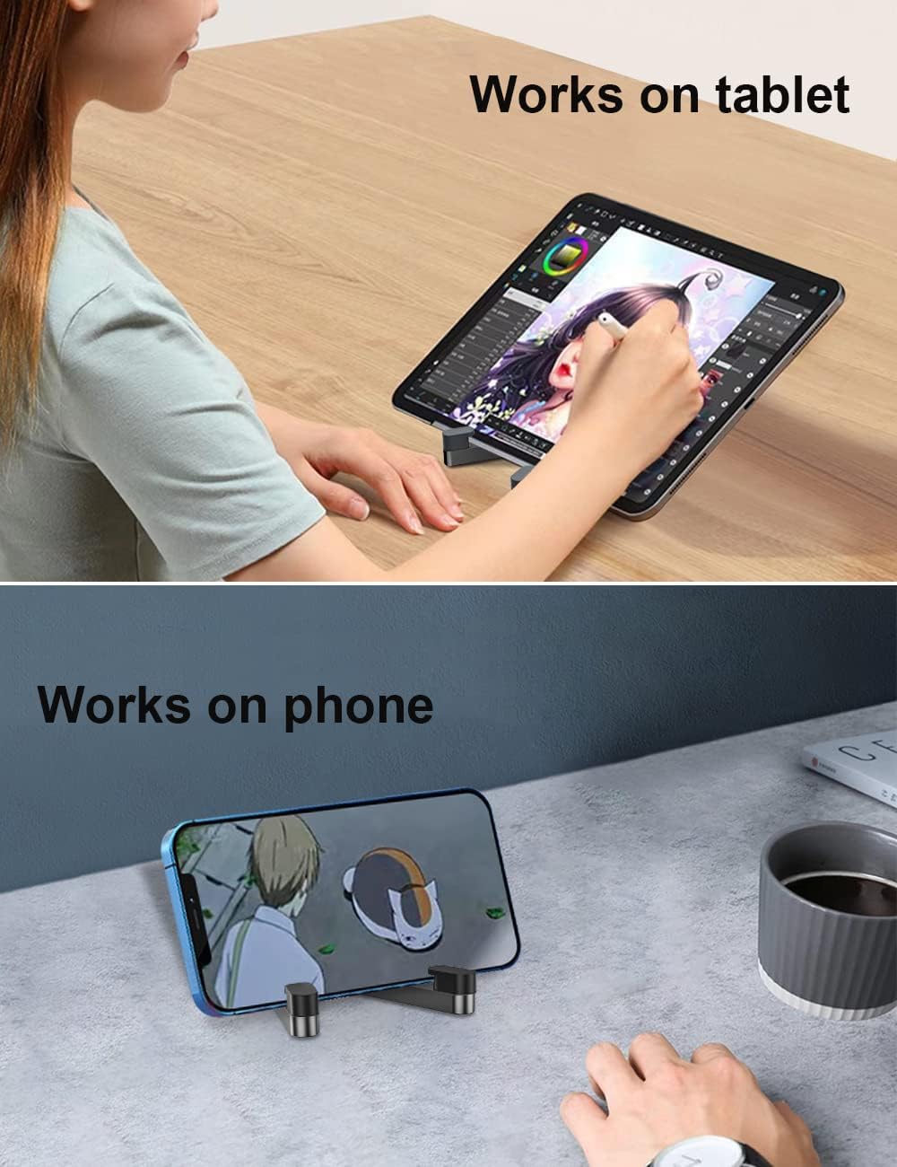 - 2 in 1 Phone Holder and Tablet Stand - Compatible with iPhone, Smartphones, iPad and most tablets in smaller than 10.5 inches. Designed on a low center of gravity makes it more stable, so it fits all size of the cell phone and various tablets.