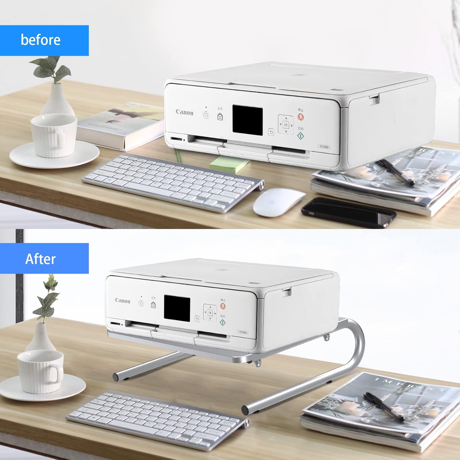 - Organization: Sleek modern silver design complements any desk and the extra space underneath the platform for a neat surface.