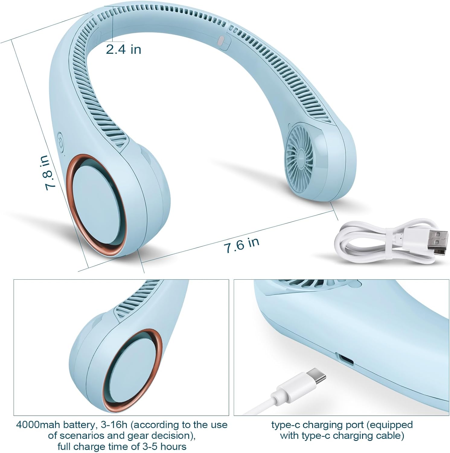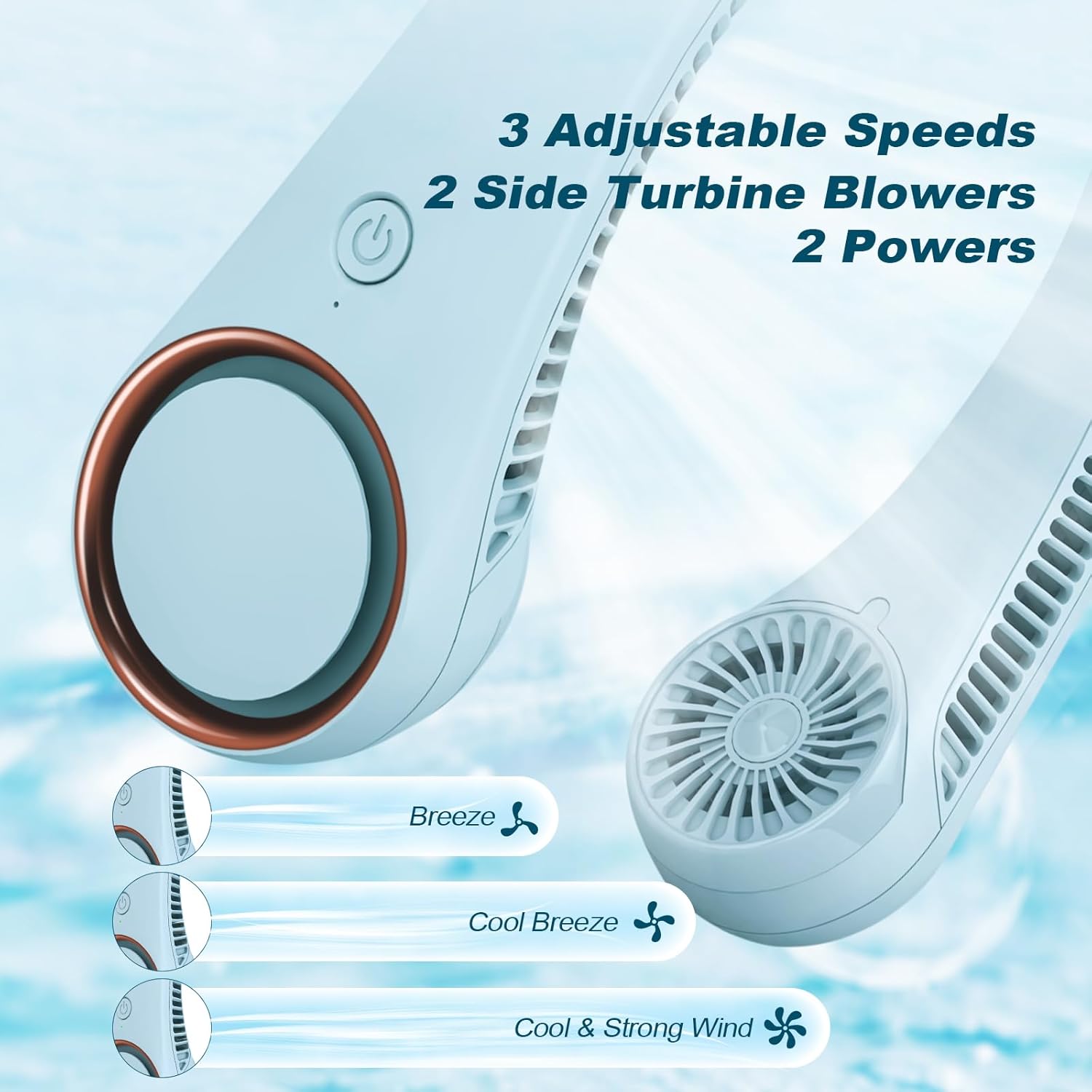 CIVPOWER Neck Fan: Portable Personal Neck Cooling Rechargeable Bladeless Fan - Hands Free 3 Speed 4000 mAh Battery USB Operated Wearable Headphone Design - for Men Women Outdoor Indoor (Light Blue)