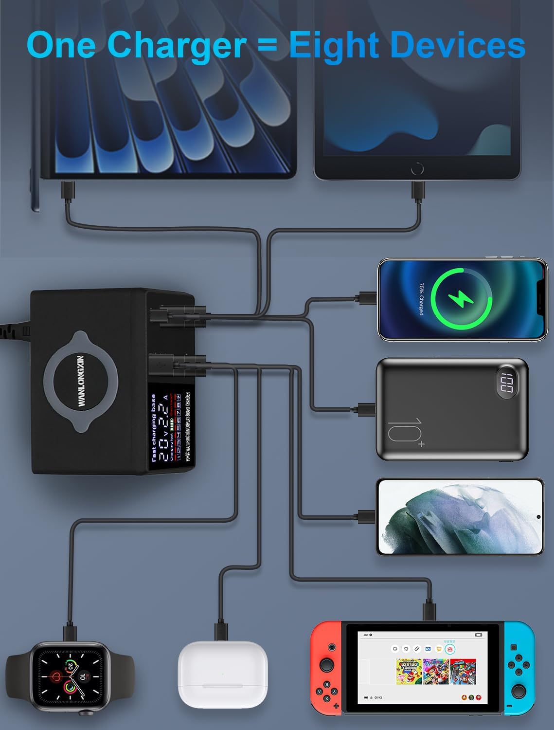 - 【WIRELESS AND SCREEN DISPLAY USB CHARGING STATION】 The charging station includes wireless charging capability and a screen display for monitoring. This multi charging station keeps all your devices powered and organized, Making it one of the best chargers for multiple devices