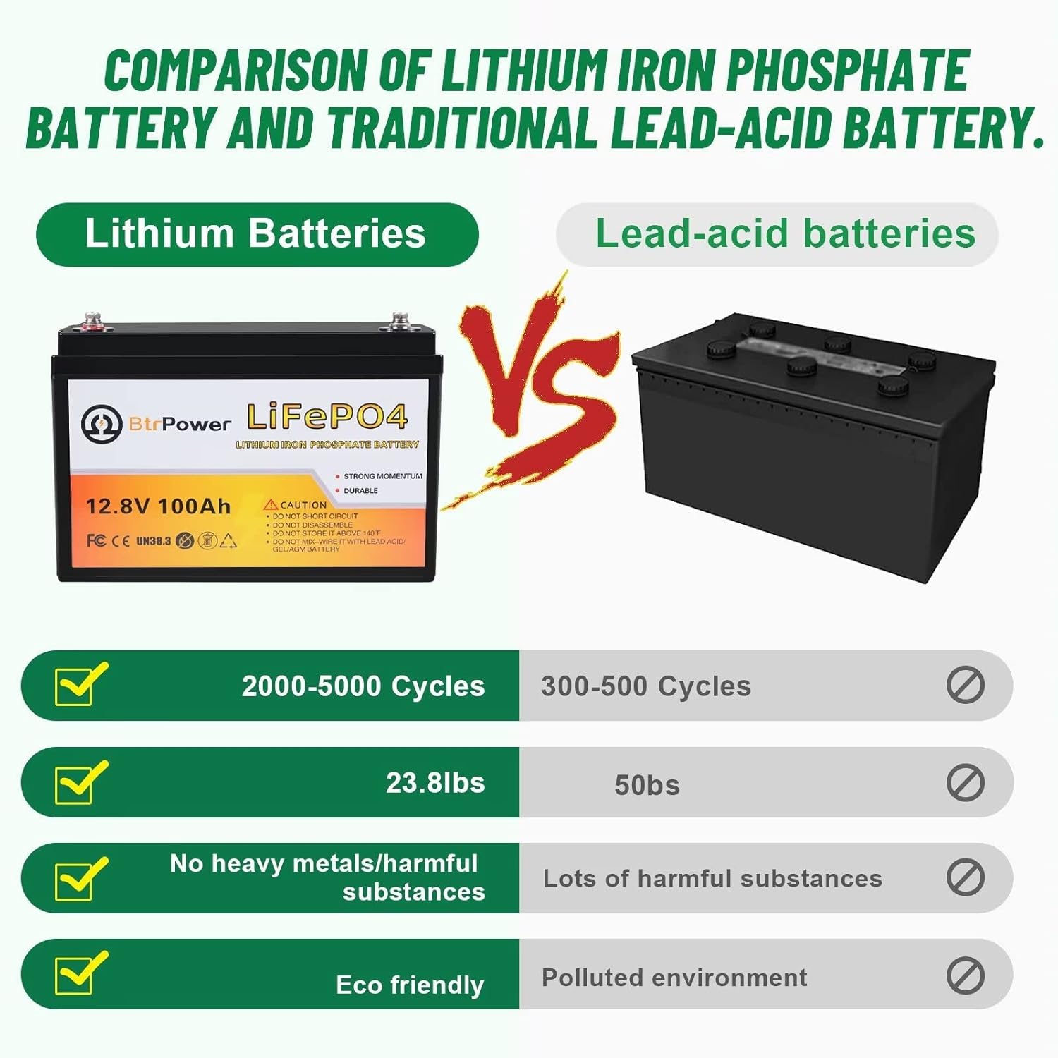 - 【Professional BMS Board】Our 12v LiFePO4 battery has built-in 100A BMS (Battery Management System) to protect it from overcharge, over-discharge, over-current, and short circuit with excellent self-discharge rate. 12v lithium batteries are safer than Lead Acid batteries.