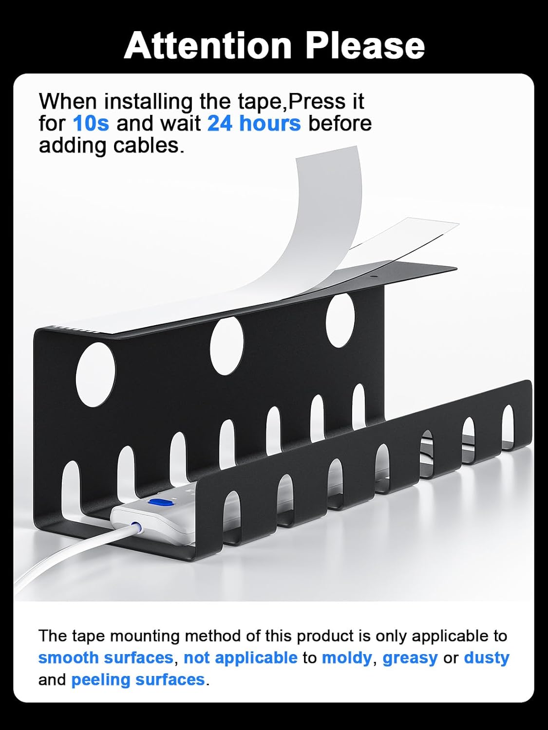 - 【Attention Please】If you choose tape mounting, please note the following three points: 1. To ensure better adhesion of the cable management tray, please make sure to clean the surface before use, the tape should only be applied to clean, dust-free, smooth and flat surfaces; the desk cord organizer is not suitable for dirty, mildewed or peeling surfaces. When installing the cable management under desk with the tape, press firmly for 10 seconds; 2. After installing the under desk cable management, wait 24 hours for the tape to fully cure before placing cables; 3. Make sure the tape is flat and free of wrinkles, which may cause the cord organizer for desk to fall off