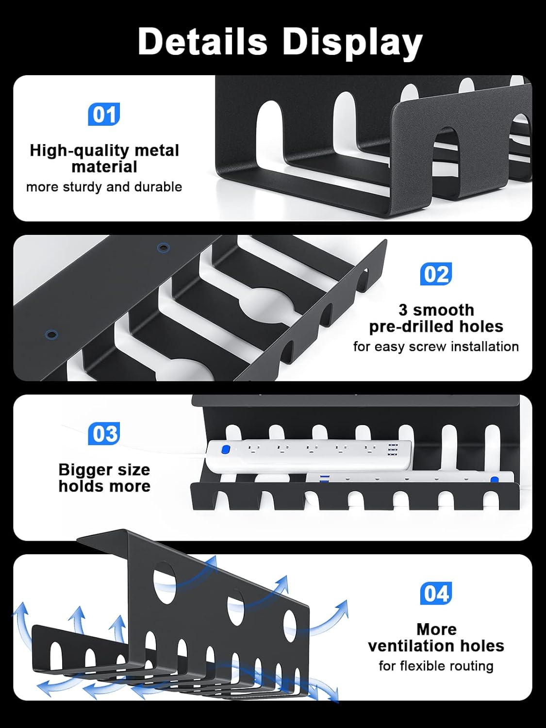 - 【Innovative Design for Heat Dissipation】The U channel desk cord organizer has 3 pre-drilled holes and multiple grooves and perforations, which not only facilitates the placement of plugs and cords, but also promotes heat dissipation of the equipment. These under desk cable management systems are suitable for different types of desks, including standing desks, adjustable desks, lift desks, glass desks, L-shaped desks, gaming tables and other common workspaces