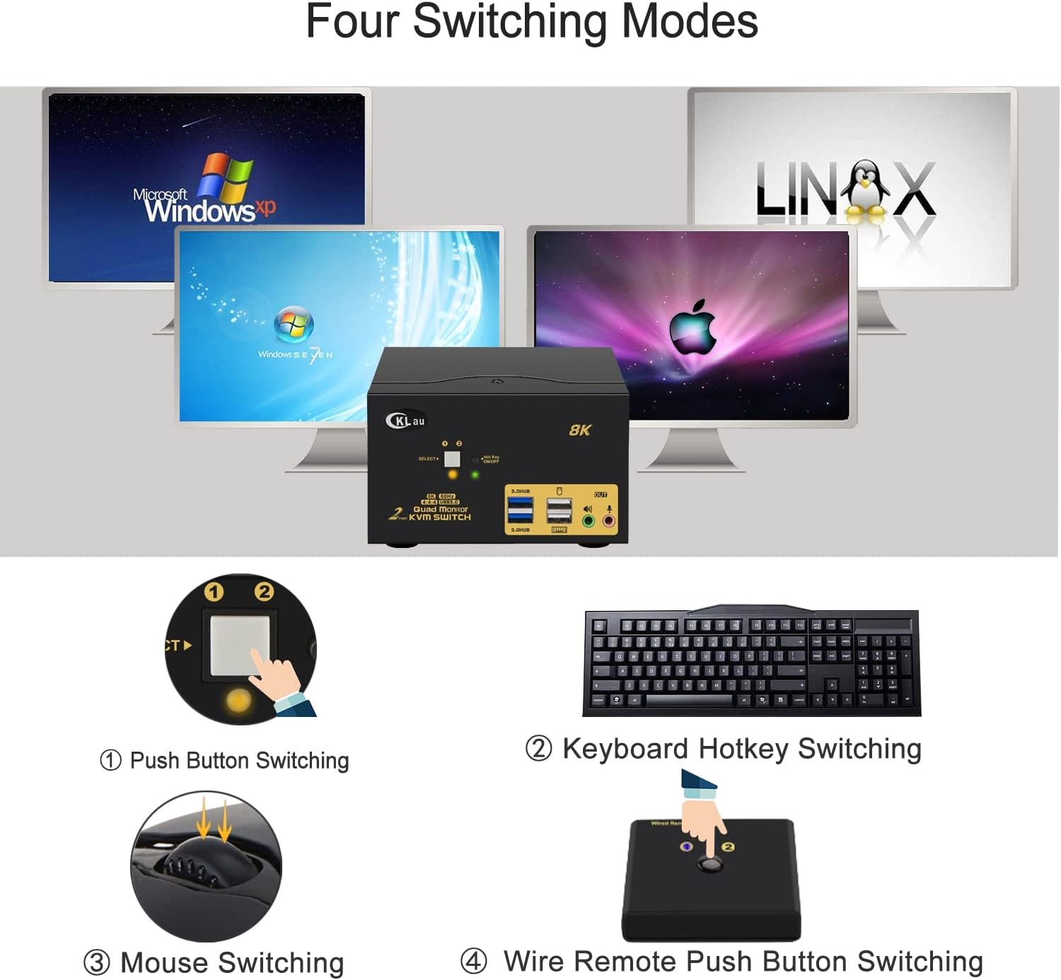 - 3. Quad Monitors KVM Switch USB 3.0: Support wired/wireless/unify keyboard and mouse, Apple keyboard (hot key is changeable), touch screen, OLED screen, 16:9 widescreen, 21:9 ultra-wide monitors, etc.