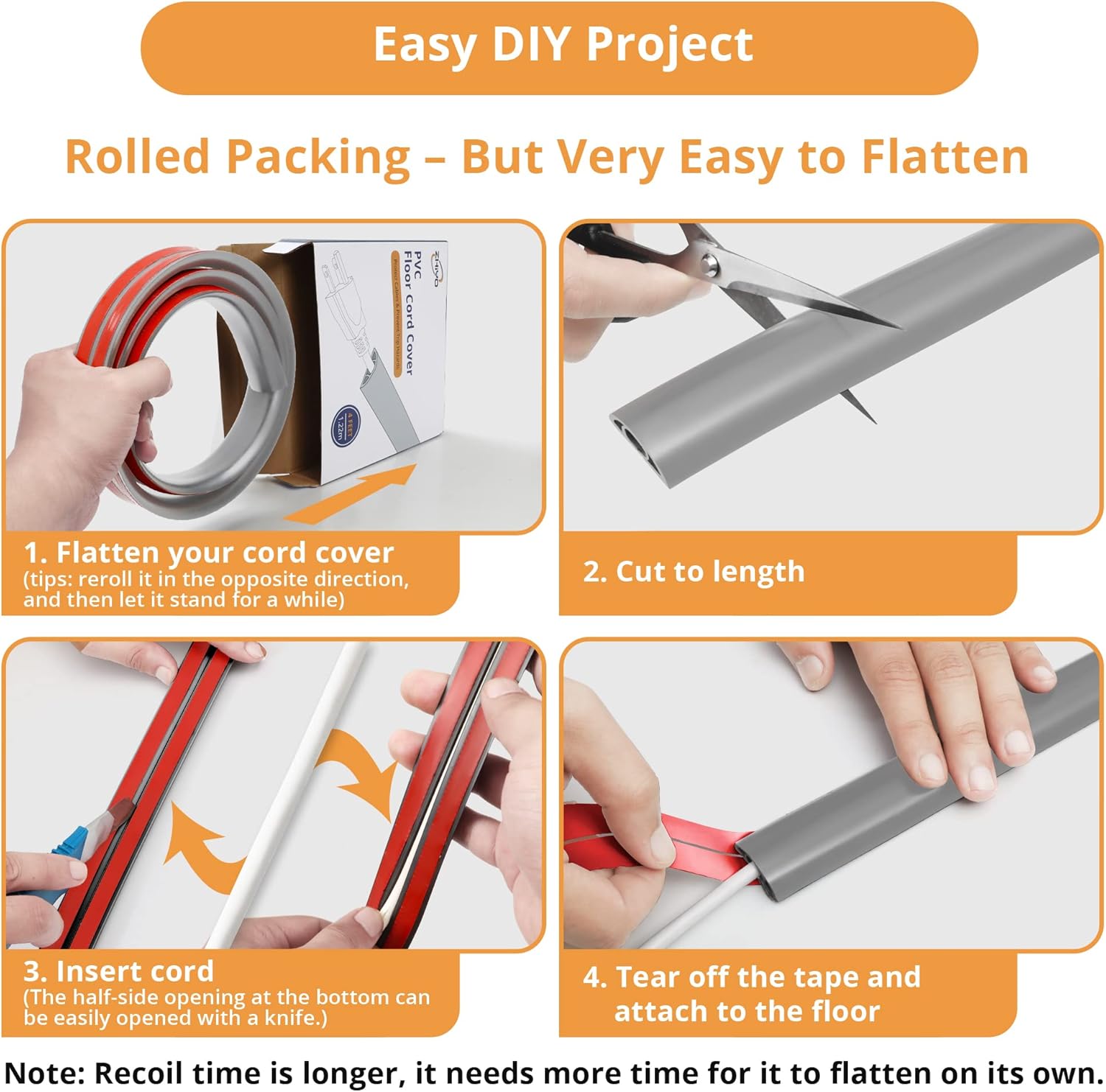 - Easy to Install: You can easily cut it to your desired length with scissors; the half-sealed design on the back of the floor cord cover can prevent deformation, and can be easily opened with a utility knife; Comes with pre-applied strong adhesive tape to help to secure it to the floor, just peel and stick