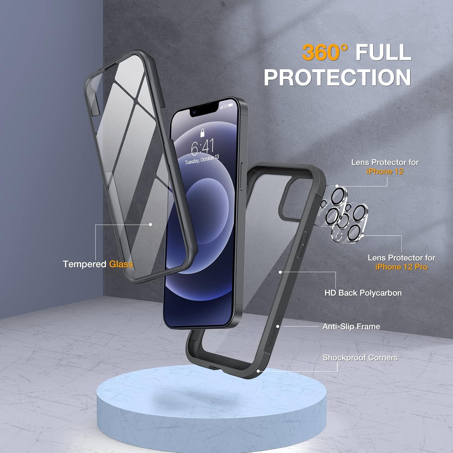 - [360° FULL-BODY RUGGED PROTECTION] The full-body protective case for iPhone 12 / 12 pro is made of flexible TPU materials and has been tested to survive drops. Its tri-layer structure absorbs and deflects impact and blocks dirt and dust. Elevated lips around the camera and the screen offer added protection against scratches.