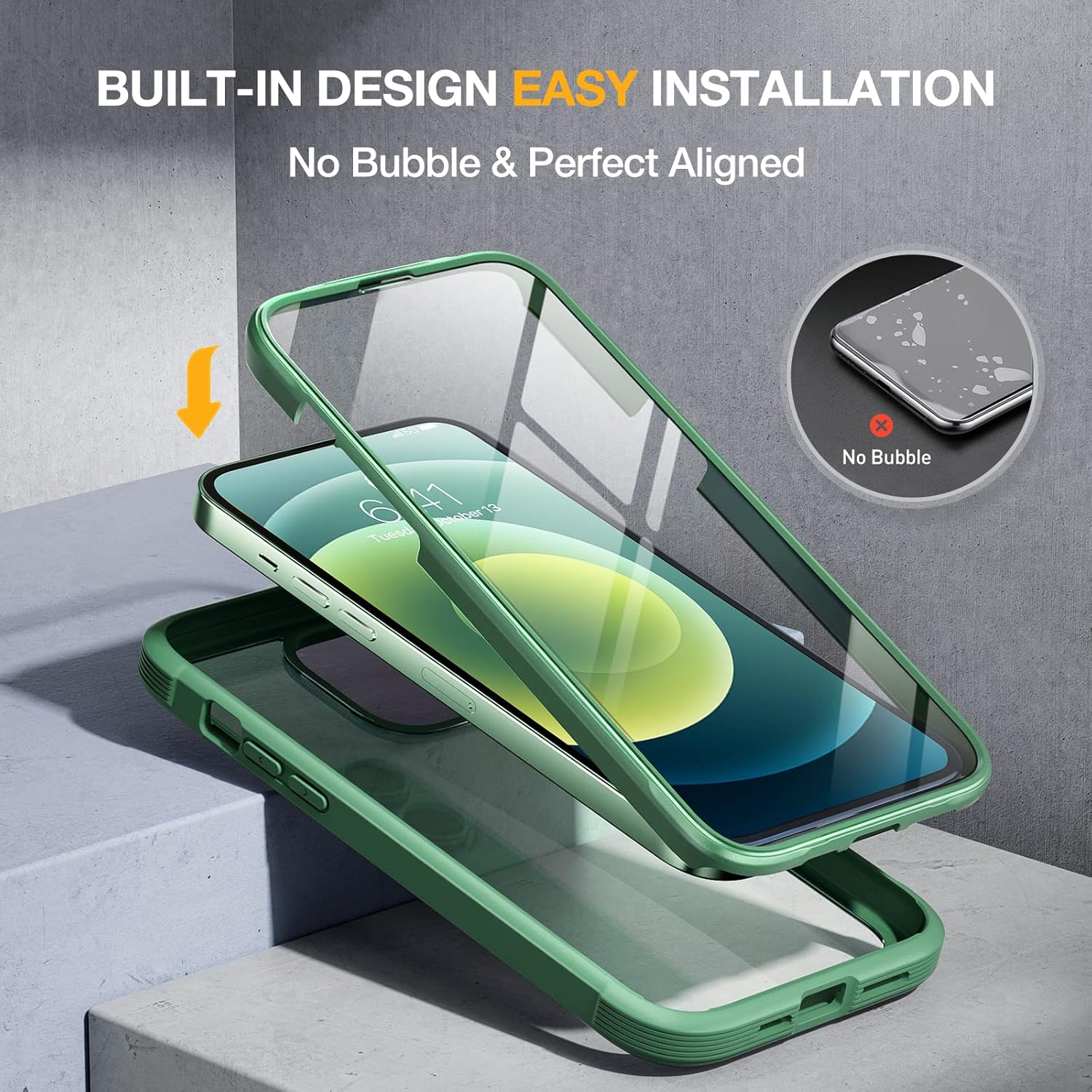 Miracase Glass Series for iPhone 12/12 Pro Case 6.1 inch, Upgraded Full-Body Rugged Phone Bumper Case Cover with Built-in 9H Tempered Glass Screen Protector and Camera Protector, Green
