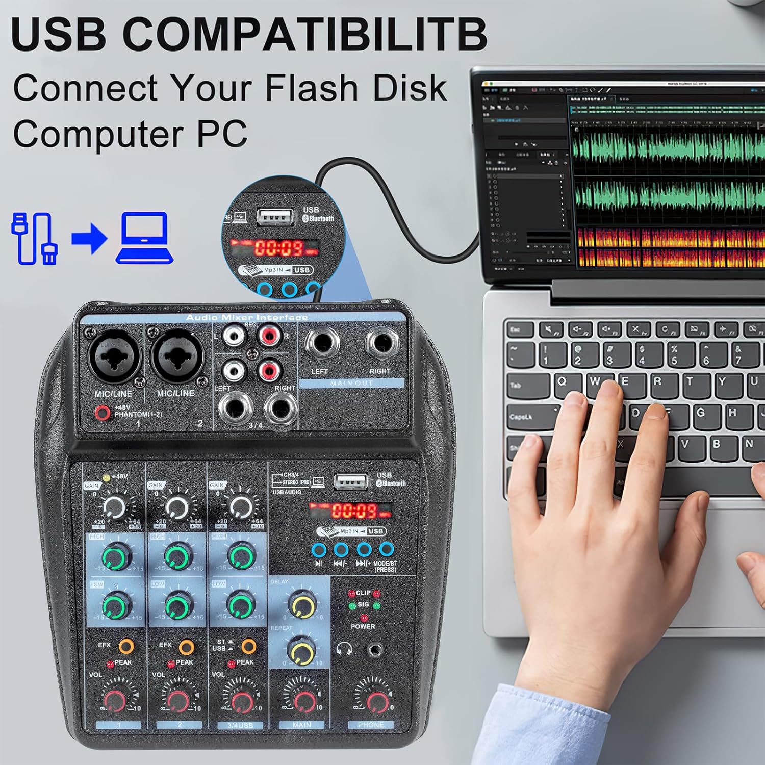 Dj Mixers 4 Channel Audio Mixer Sound Board with Bluetooth, Portable Usb Audio Interface with 48V Phantom Power Small Sounds Mixer Board with FX Delay Effect for Streaming