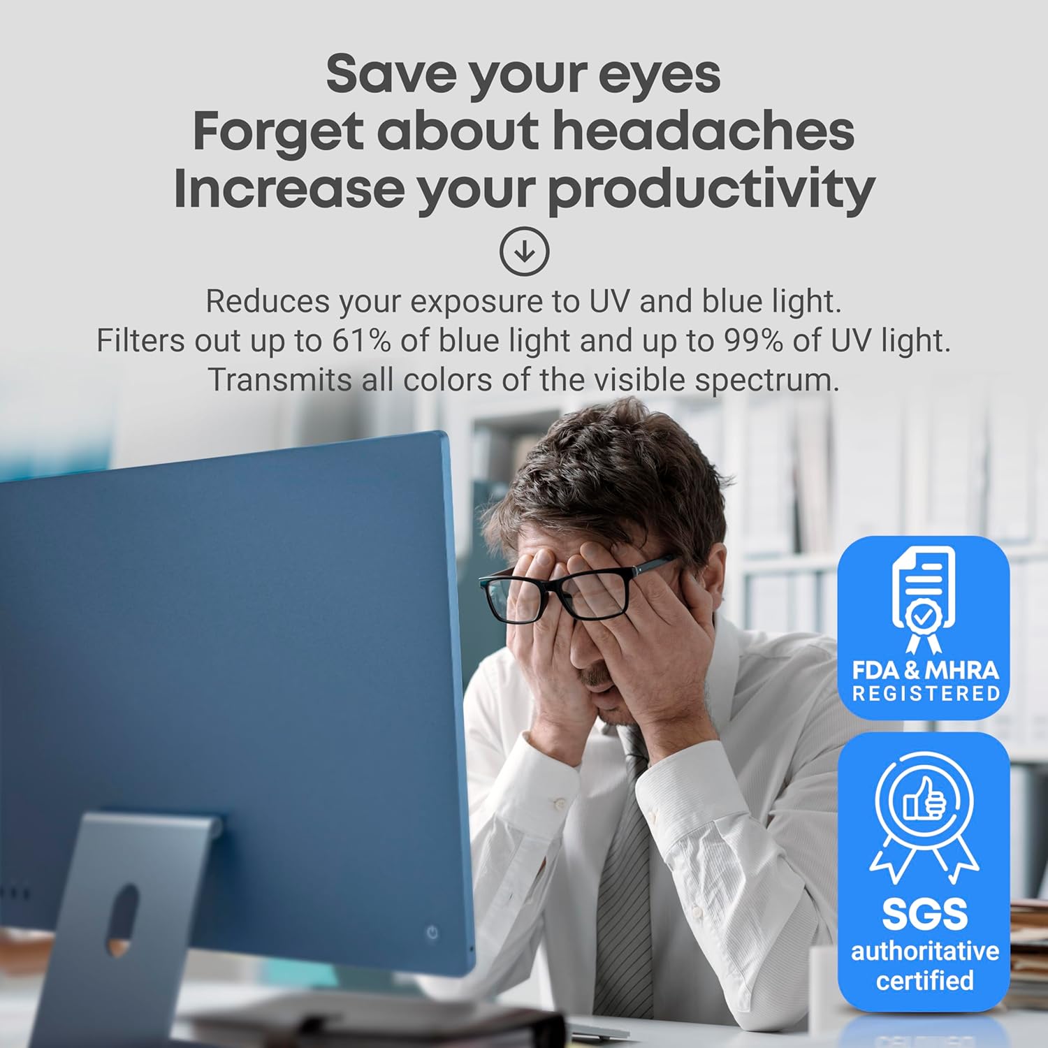 - Eye Comfort: Blue light screen protector reduces eye strain by filtering up to 61% of blue light and 99% of UV light. This blue light screen protector doesn’t have an Anti-Glare function