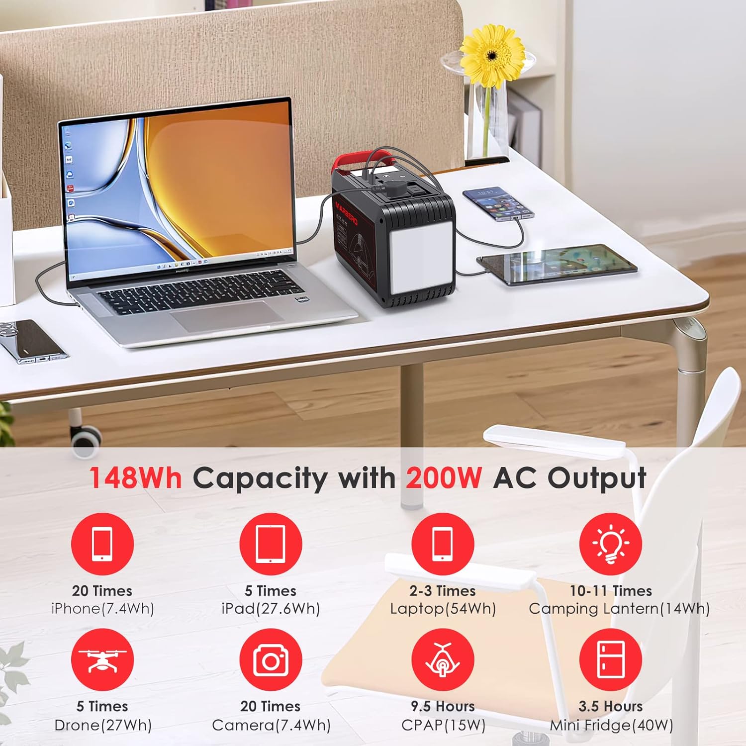 - UPGRADED PORTABLE POWER: As from the last upgrading, this portable power station of MARBERO is called M822 which is another same outfit design as the MARBERO M82. This brand new battery generator has an even more powerful capacity of 146Wh(equiv. 40,000mAh/3.7V) and much more power output of 200W, which can support more usage situations and more appliances with a convenient small size(7.5*5.3*3.6 in, 3.3 lbs) but a more powerful inside.