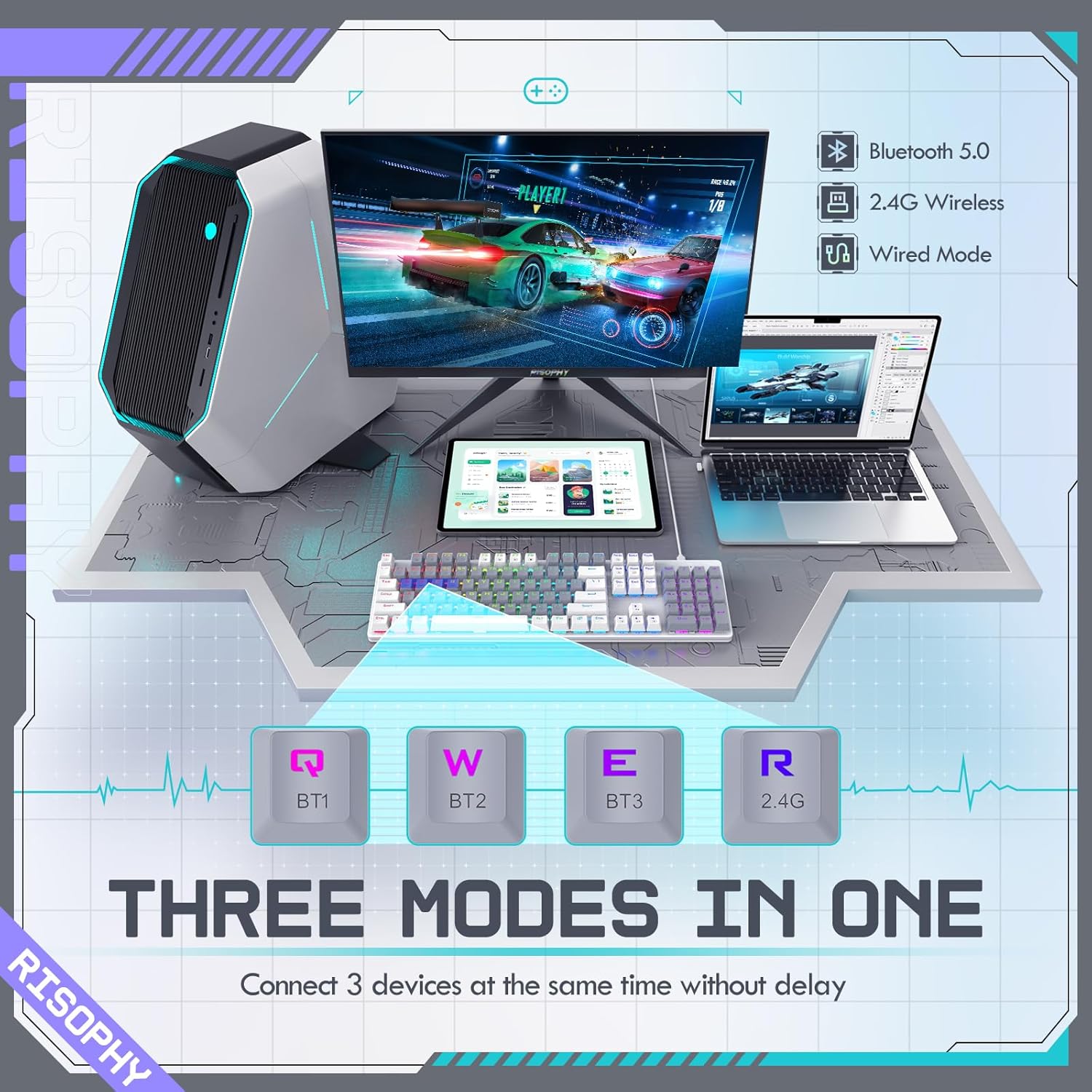 - ใ๐๐ข๐ซ๐๐ฅ๐๐ฌ๐ฌ+๐๐ฅ๐ฎ๐๐ญ๐จ๐จ๐ญ๐ก+๐๐ข๐ซ๐๐ใThe bluetooth gaming keyboard has 3 connection modes: wireless mode for lag-free operation, Bluetooth for efficient power consumption, and the detachable USB-C cable charges while in use. can be connected to PC, laptop, iPad, mobile phone, up to 5 devices to double the office efficiency.