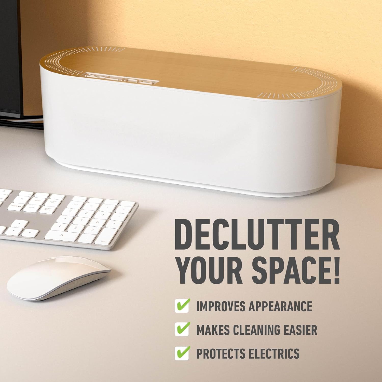 D-Line Cable Management Box, Power Strip Holder, Floor Outlet Hiders, Desk Cord Organizer, Cover TV Wires, Wire Storage, Extension Hider, Office Concealer for Cords - Large, Wood-Effect Lid