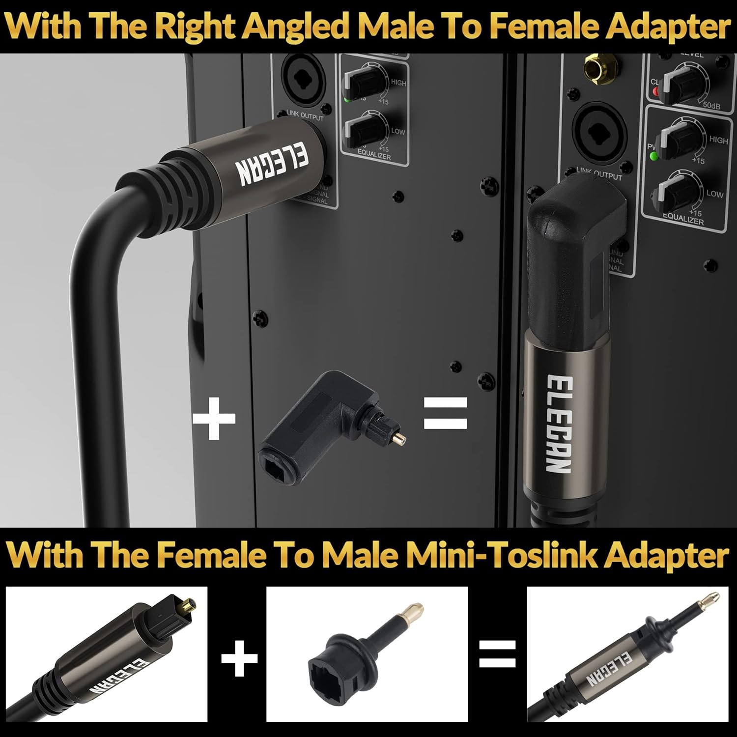Elecan Optical Audio Cable 100 Ft Digital Audio Toslink Cable Cord-Fiber Optic-Gold Plated-Flexiable&Durable-for Home Theater,Sound Bar,PS4&Xbox-with 4 Right Angled and Mini Toslink Adapters+Ties