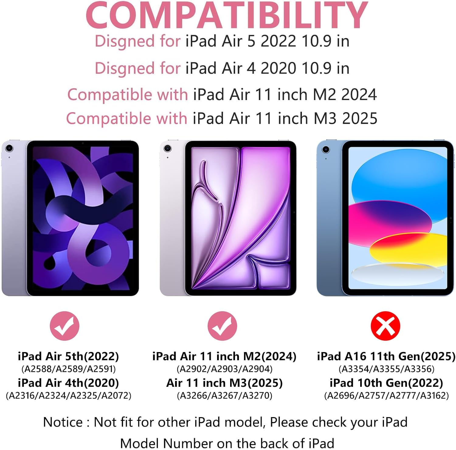 - For iPad Air 11 inch Case with Keyboard: This for ipad air keyboard case compatible with iPad Air 11-inch M3 2025 (A3266/A3267/A3270), compatible with iPad Air 11-inch M2 2024 (A2902/A2903/A2904), compatible with iPad Air 5th Generation 10.9 inch 2022 (A2588/A2589/A2591), compatible with iPad Air 4th Generation 2020 ( A2072/A2316/A2324/A2325 ), compatible with iPad Pro 11 inch 1st Generation 2018 (A1980/A2013/A1934). ( Please kindly check the model number on the back of iPad before purchasing.)